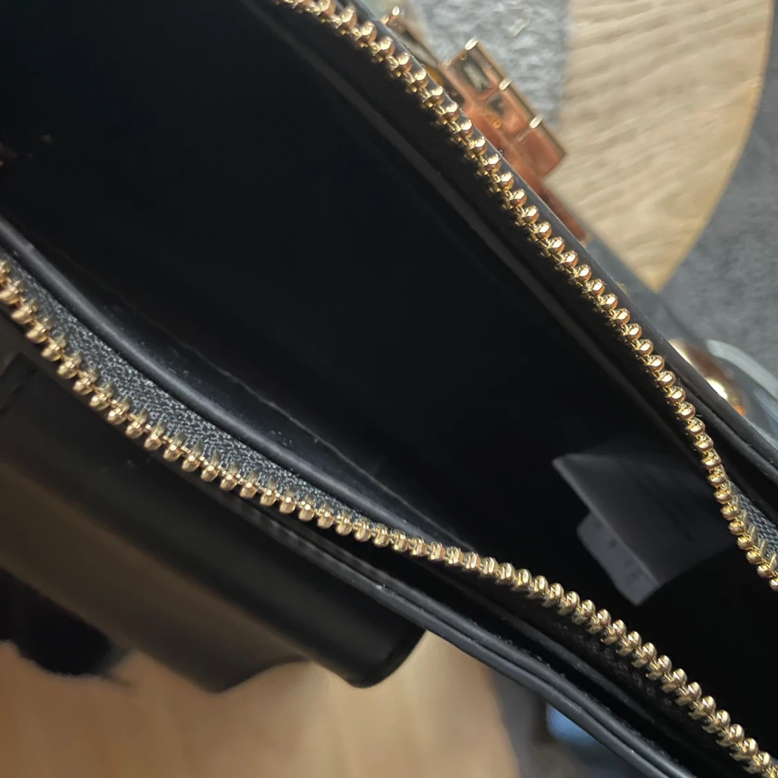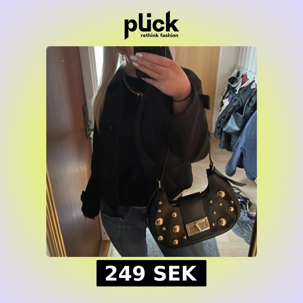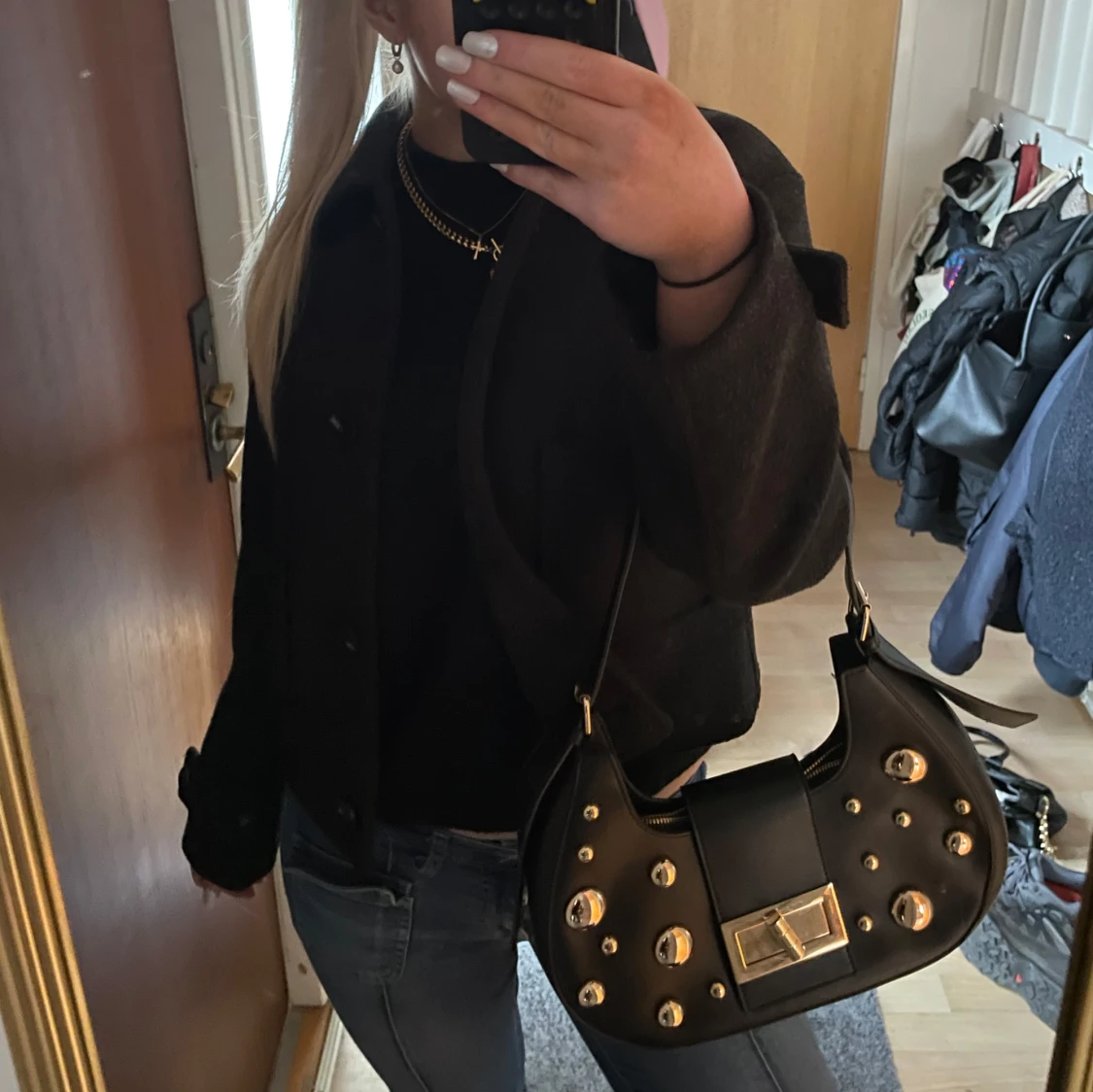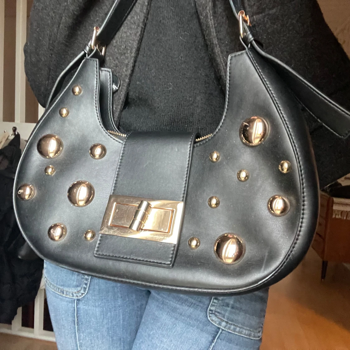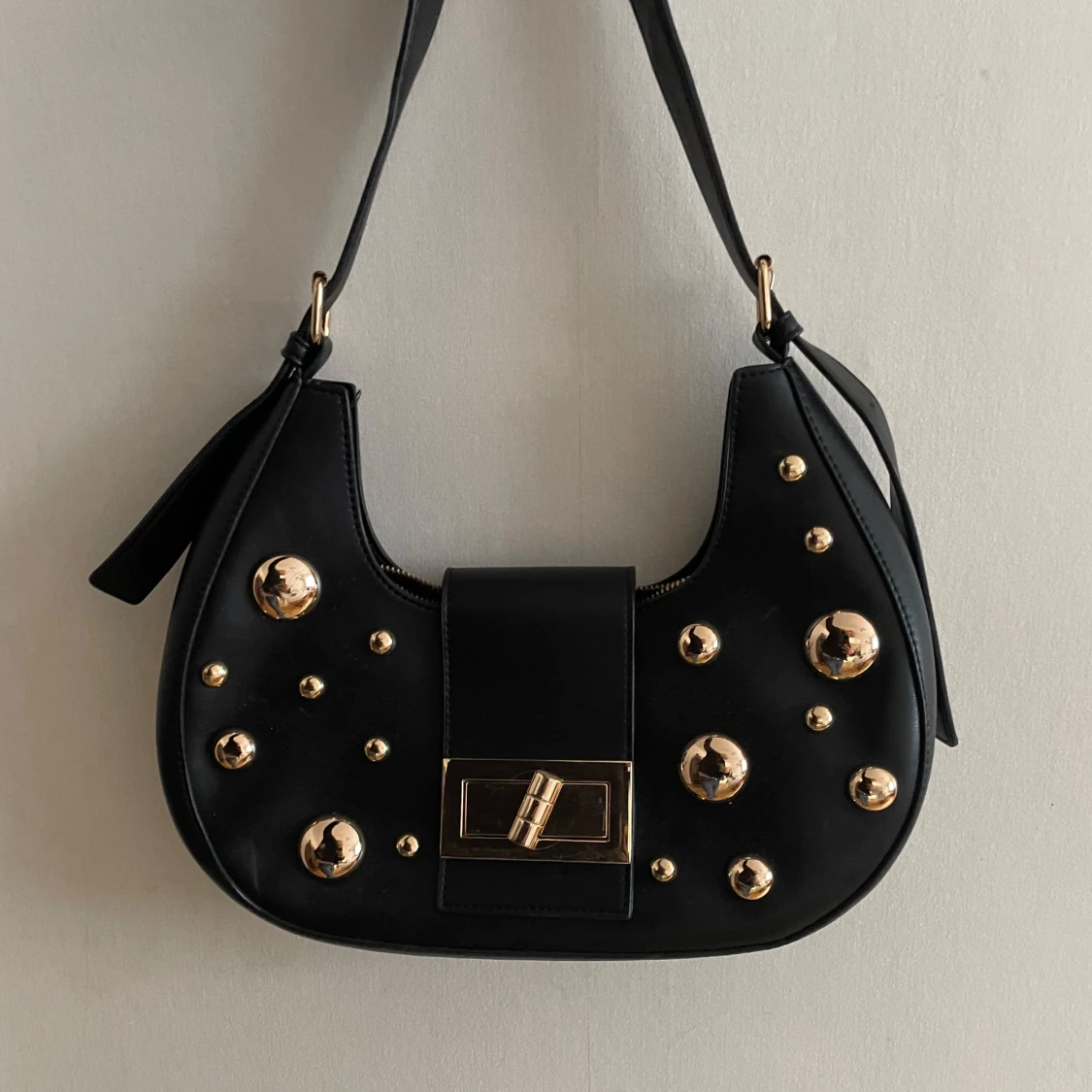 Snygg svart axelväska i skinn med coola guldfärgade nitar och ett stilrent spänne framtill. Väskan har en praktisk dragkedja och justerbar axelrem.