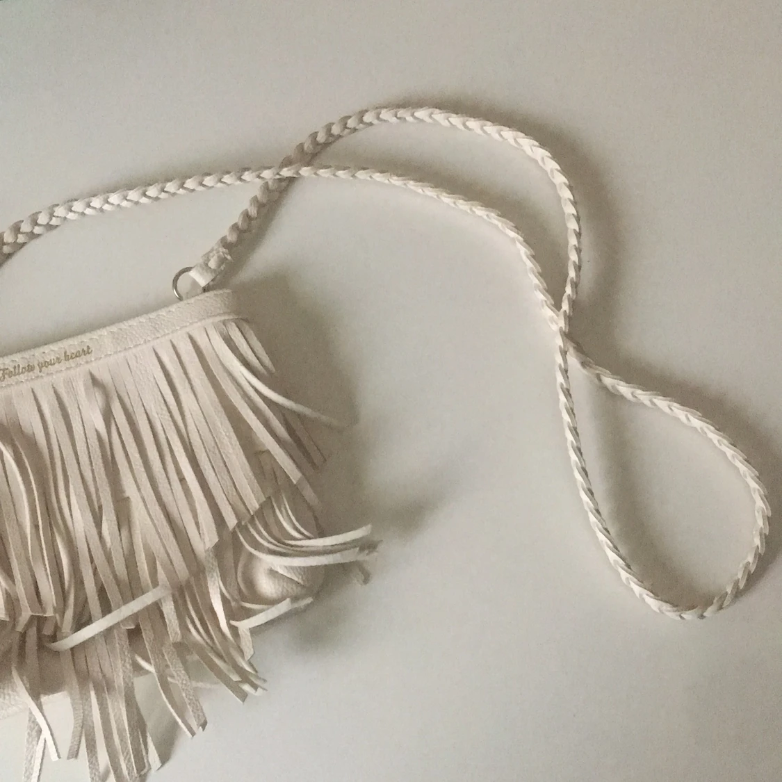 Beige axelremsväska från H&M, Har fått lite blå färg på toppen, men annars väldigt bra skick! Flätad remm.