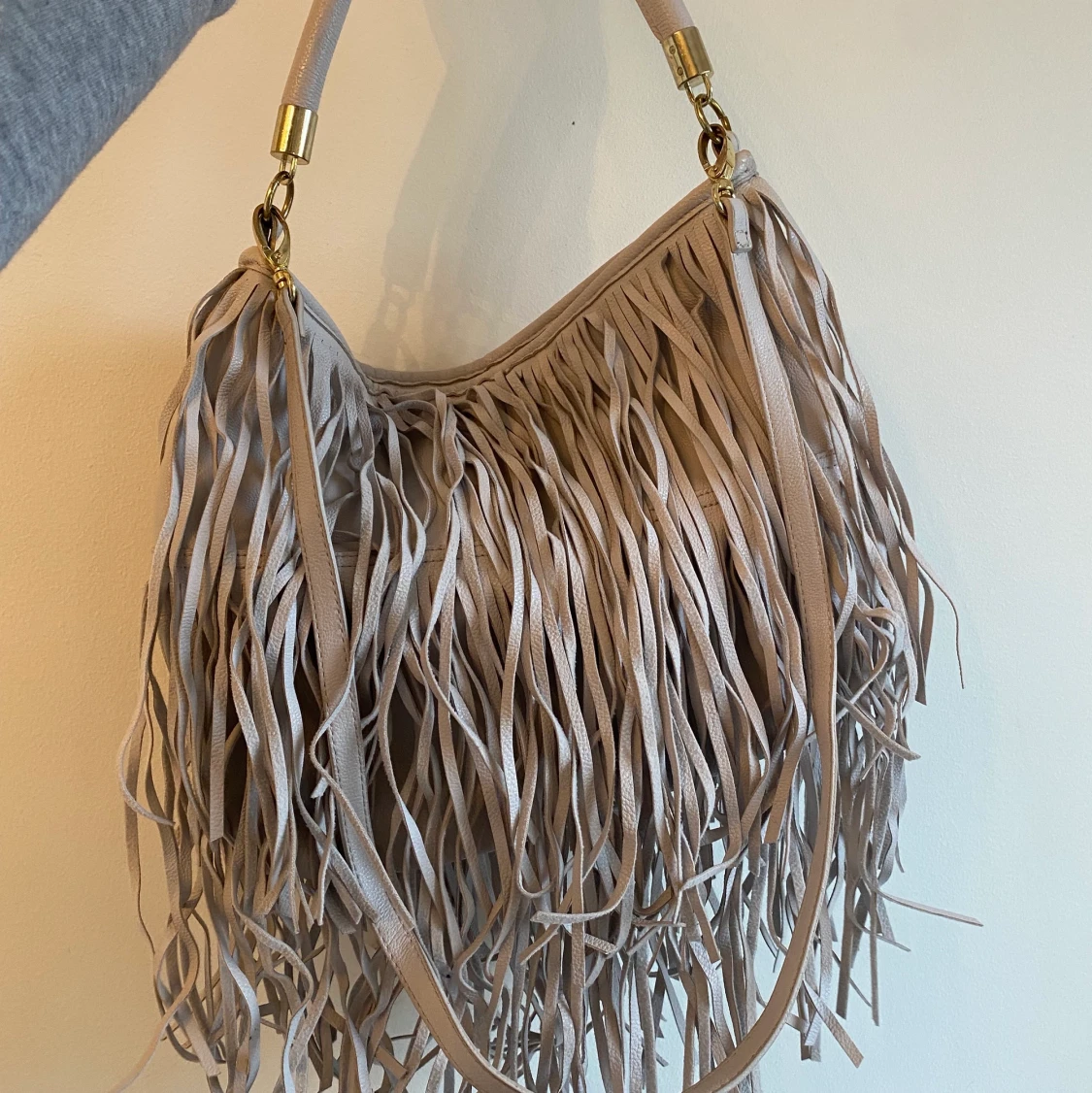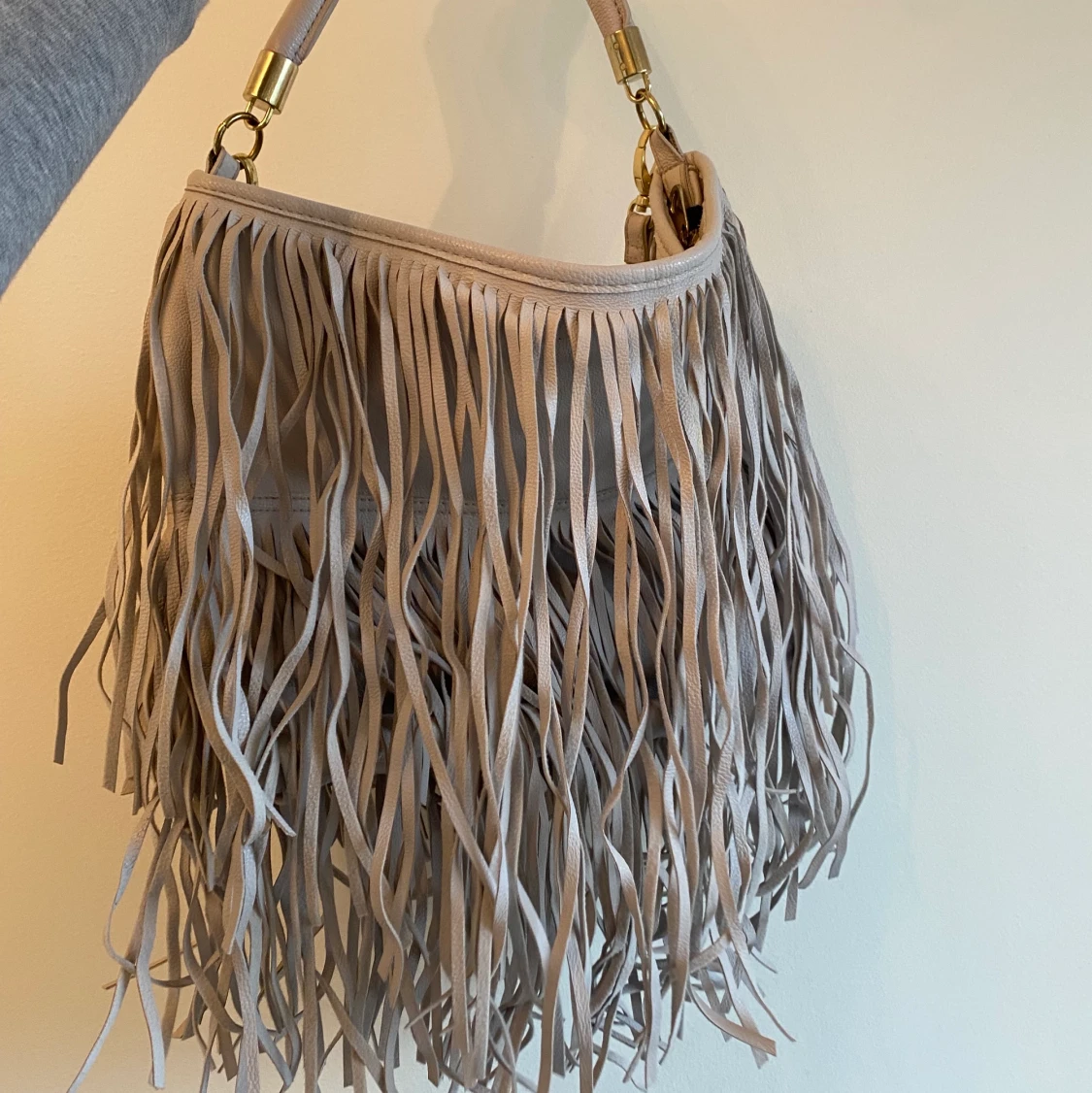 Ljusgrå fransväska från H&M. I bra skick då jag använt den kanske en gång. Köparen står för frakt annars kan jag mötas upp i Nacka forum eller Östermalmstorg 🤍