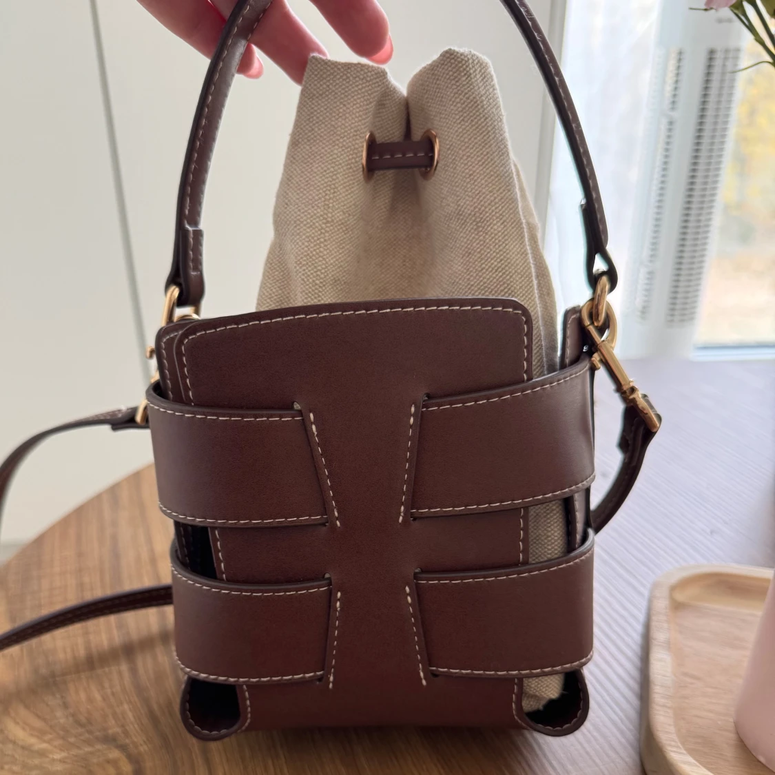 Snygg axelväska i brun skinn med beige insida i bomull. Väskan har coola detaljer med synliga sömmar och snörning upptill. Guldiga metalldetaljer och justerbar axelrem gör den både praktisk och trendig. Perfekt storlek för det viktigaste.