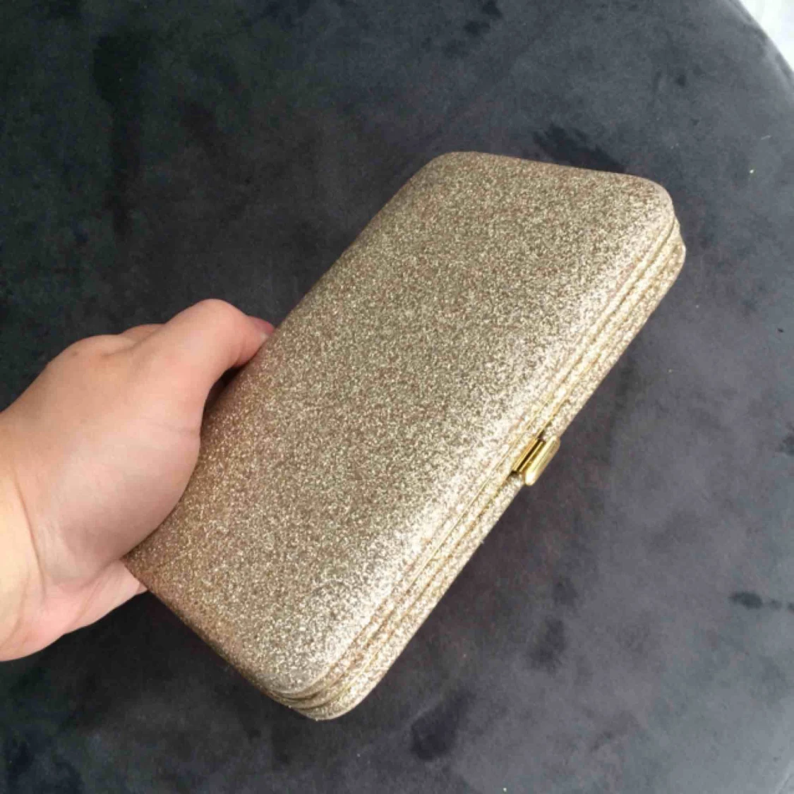 En ljusguld-glittrig clutch med olika fack. Snygg till fest!