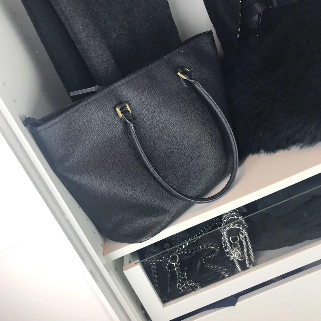 Stilren och rymlig väska med gulddetaljer, två mindre och ett större fack inuti.