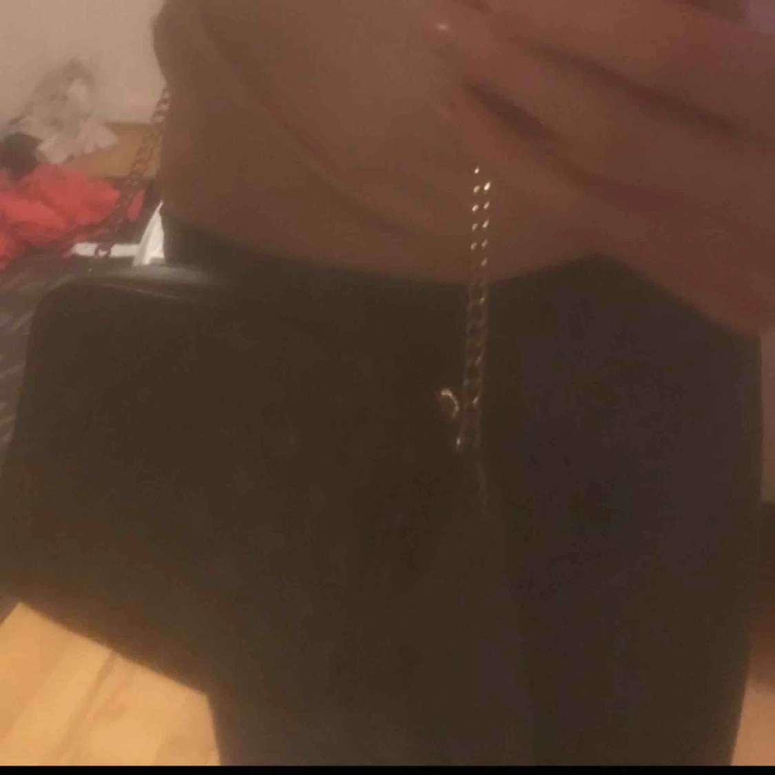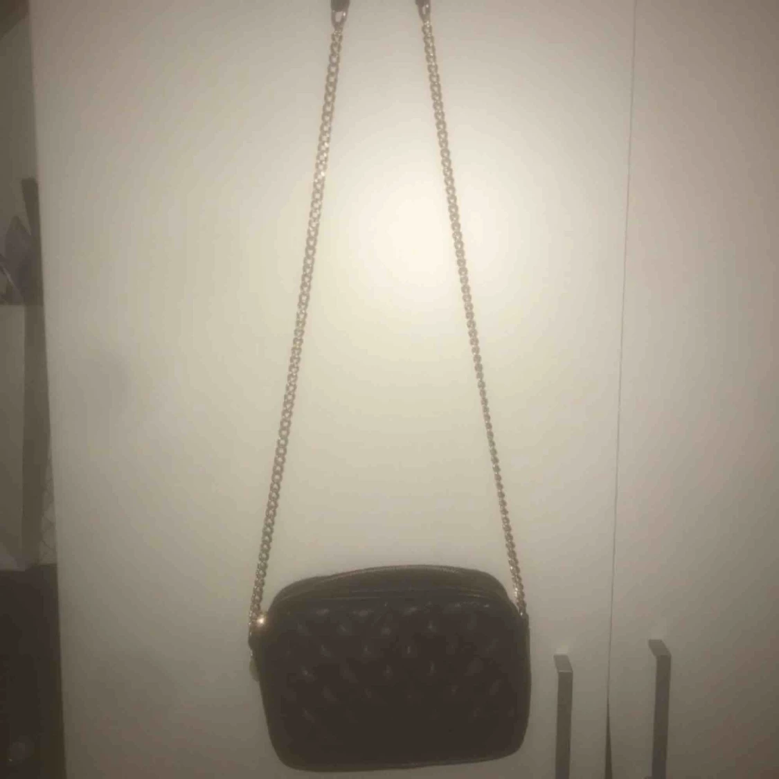 En svart crossover väska från hm som går ungefär ner till höfterna. Guldig kedja och ”vaddar” på sidorna. Stort utrymme inuti väskan.