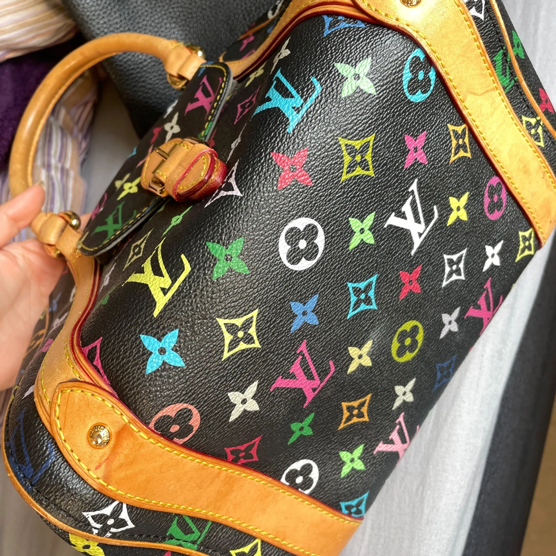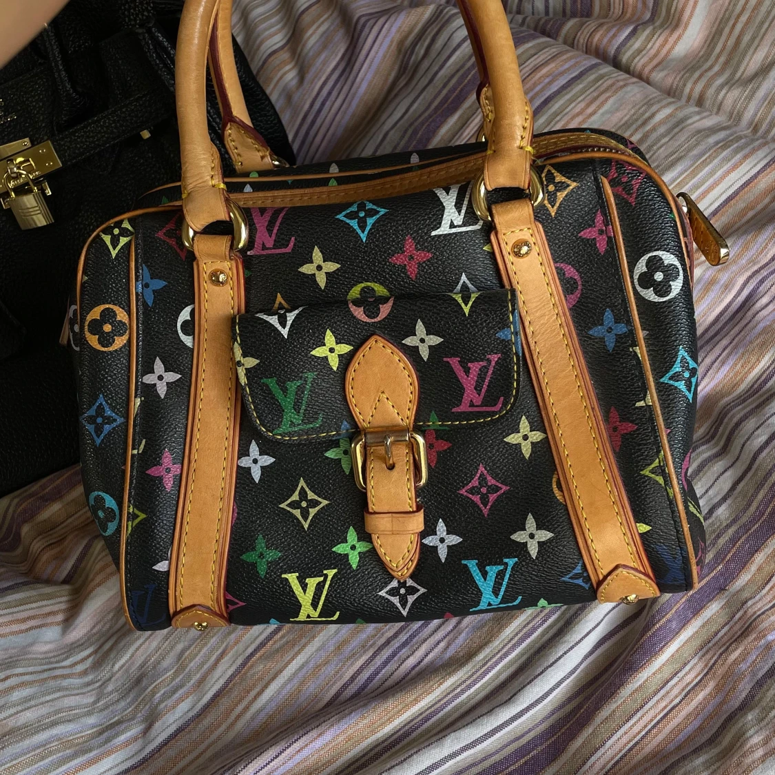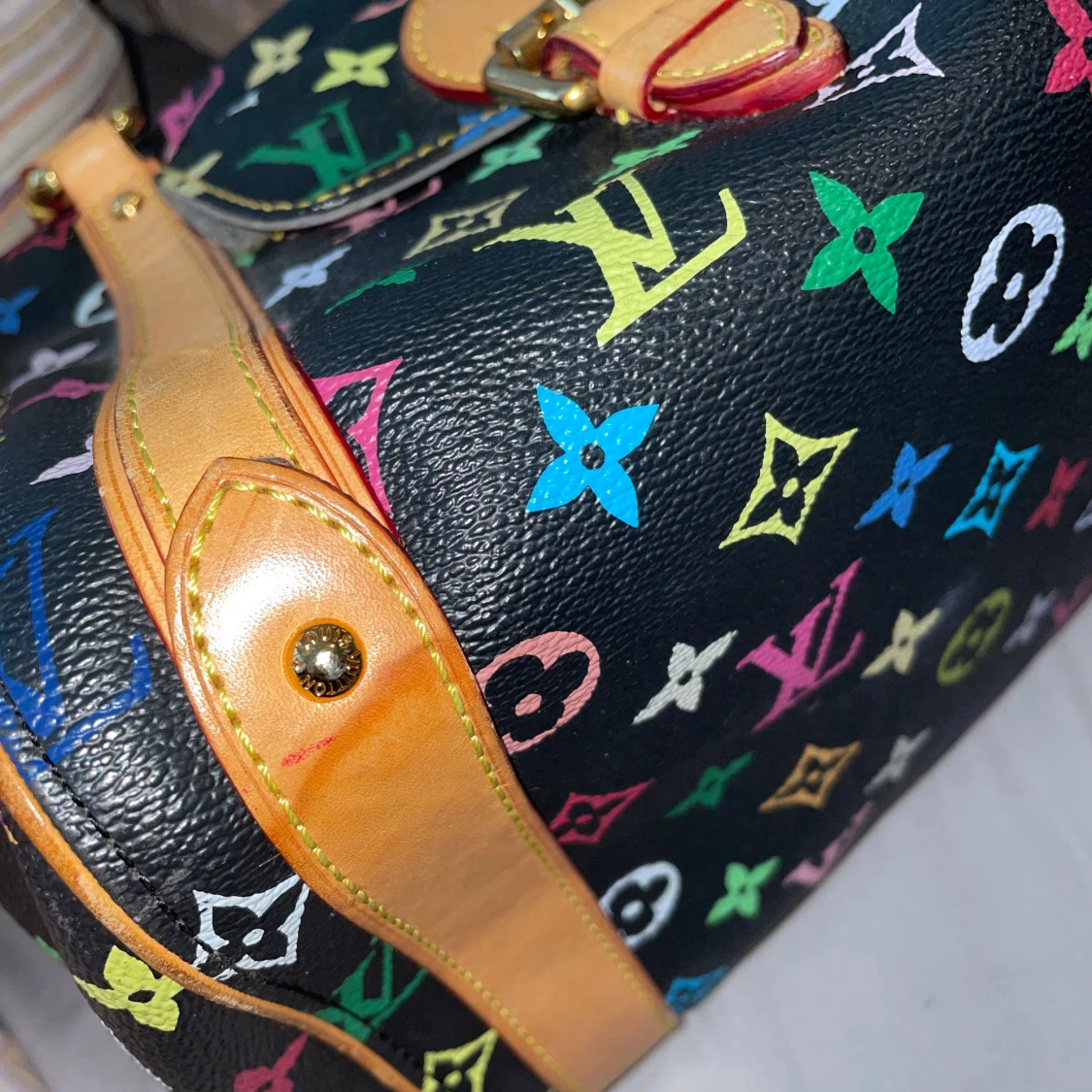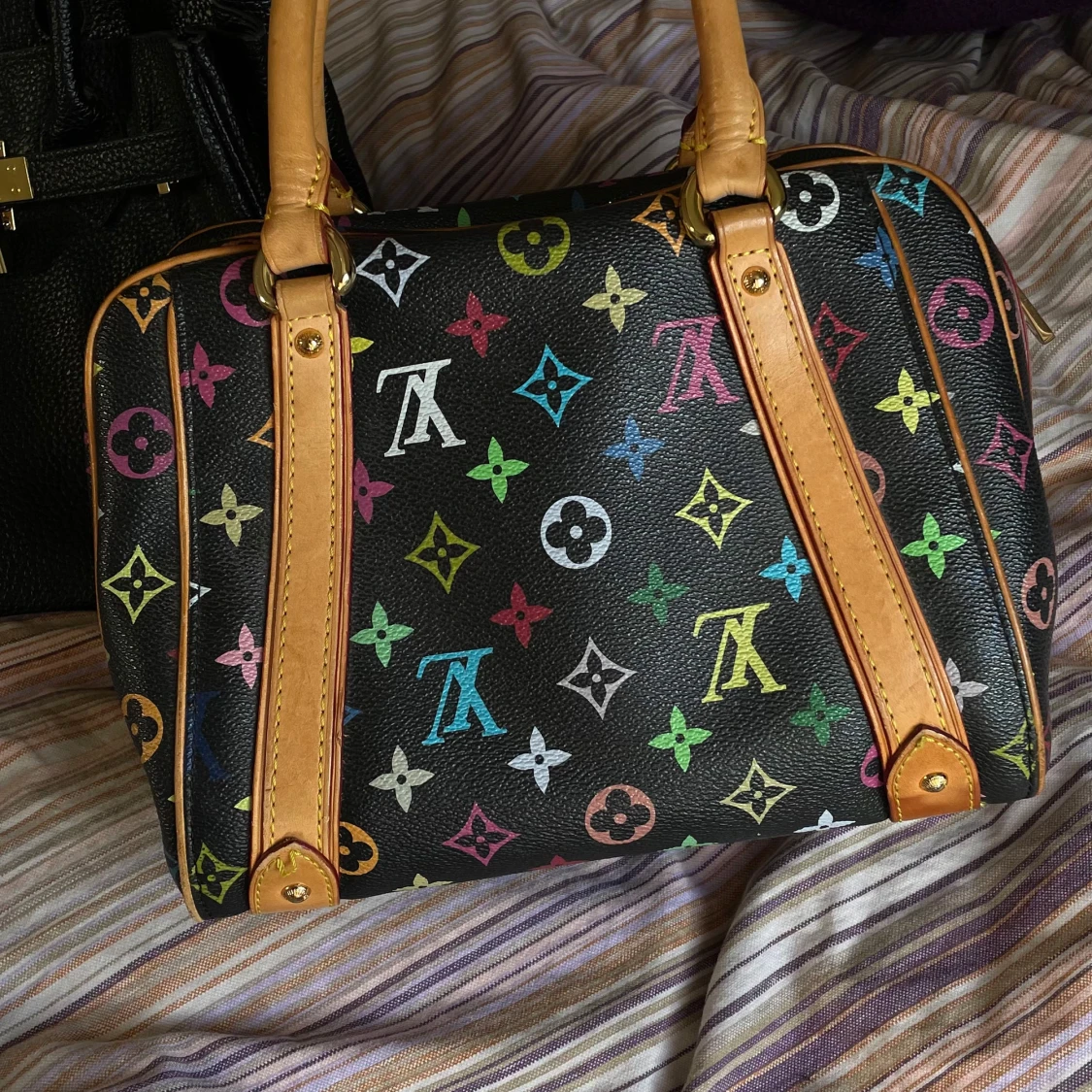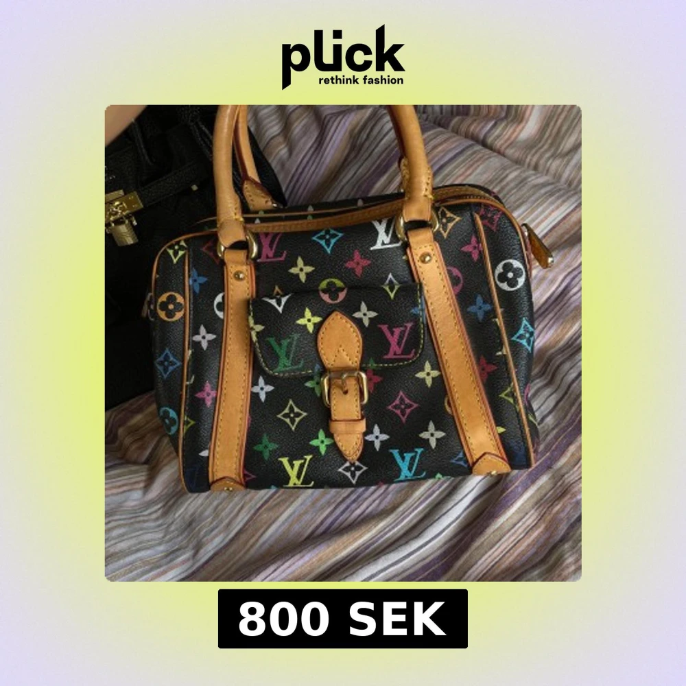 Säljer en ikonisk handväska i svart med färgglatt monogrammönster. Väskan har detaljer i ljust skinn, guldiga metalldelar och en praktisk ficka framtill med spänne. Klassisk boxig form och dragkedja upptill. Perfekt för dig som vill sticka ut.
