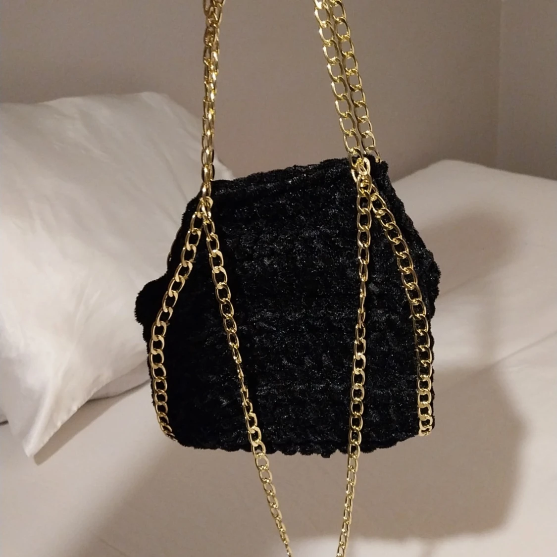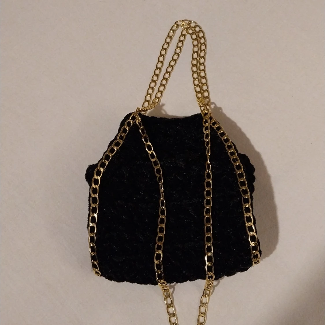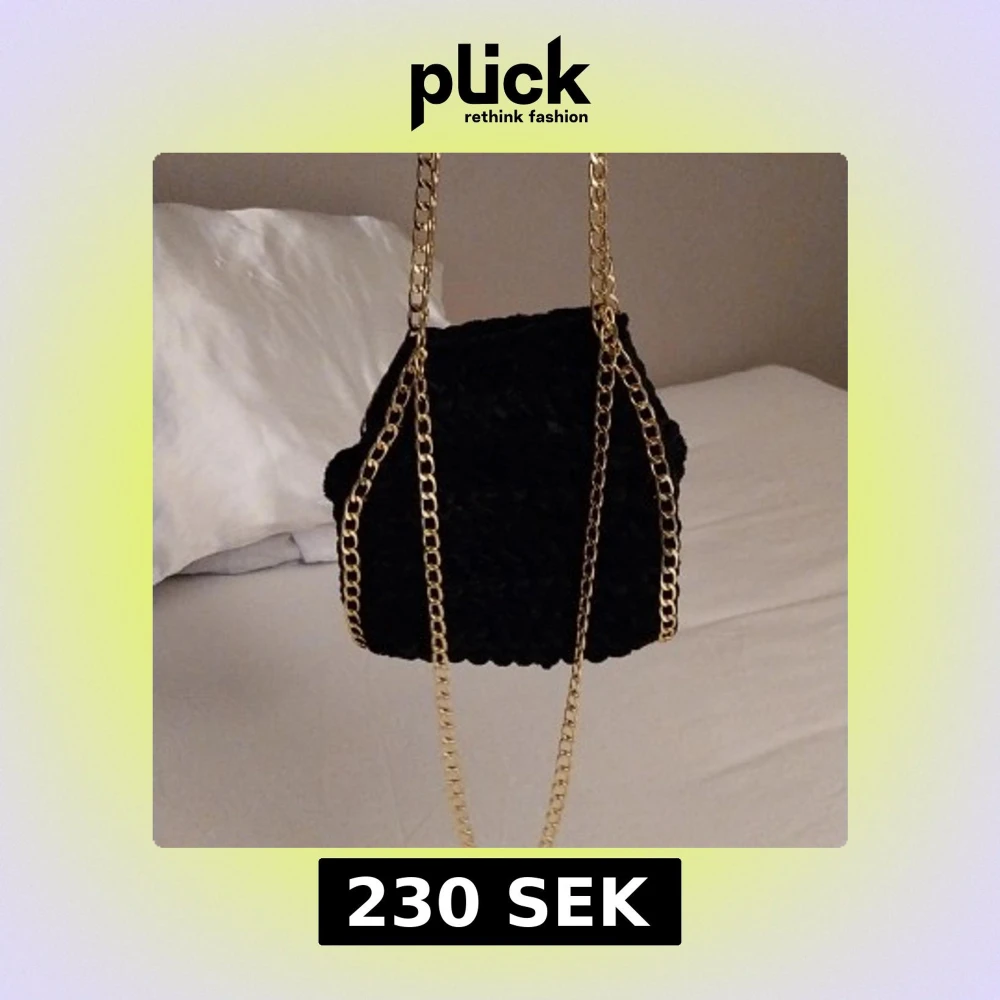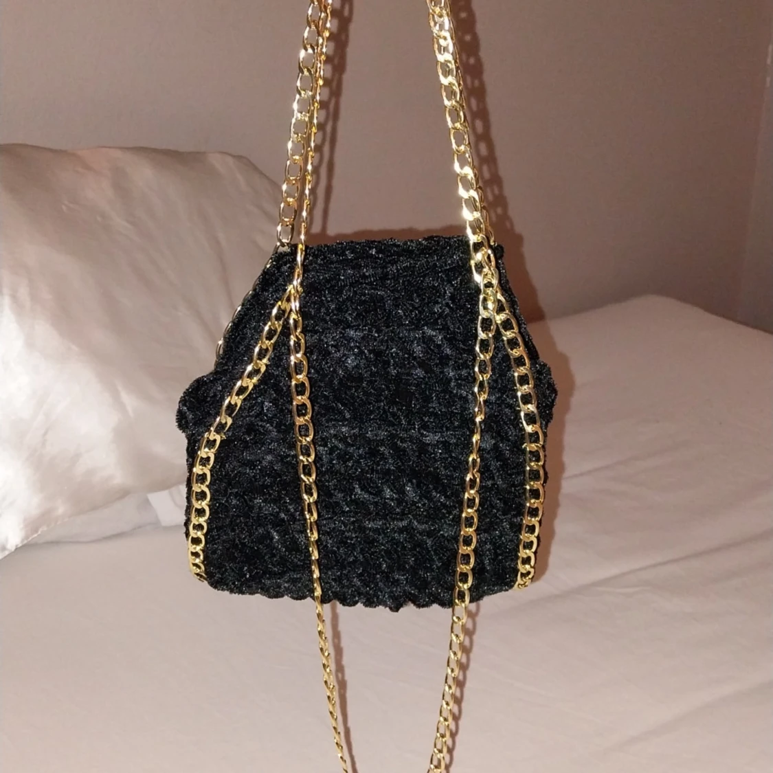 Snygg svart virkad väska i med en elegant guldkedja. Perfekt för att ge en lyxig touch till din outfit. Väskan har en unik form och är en riktig statement piece.