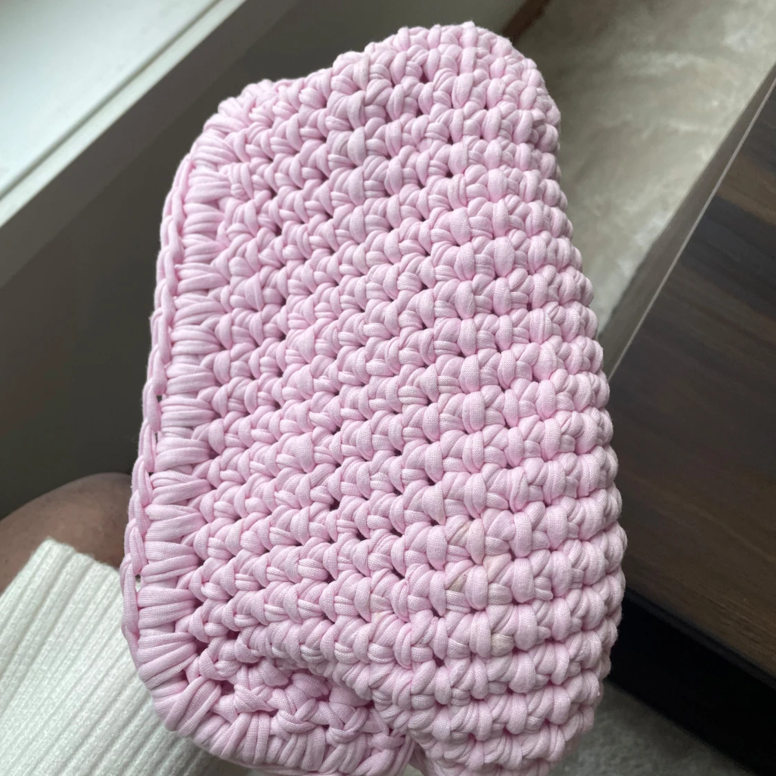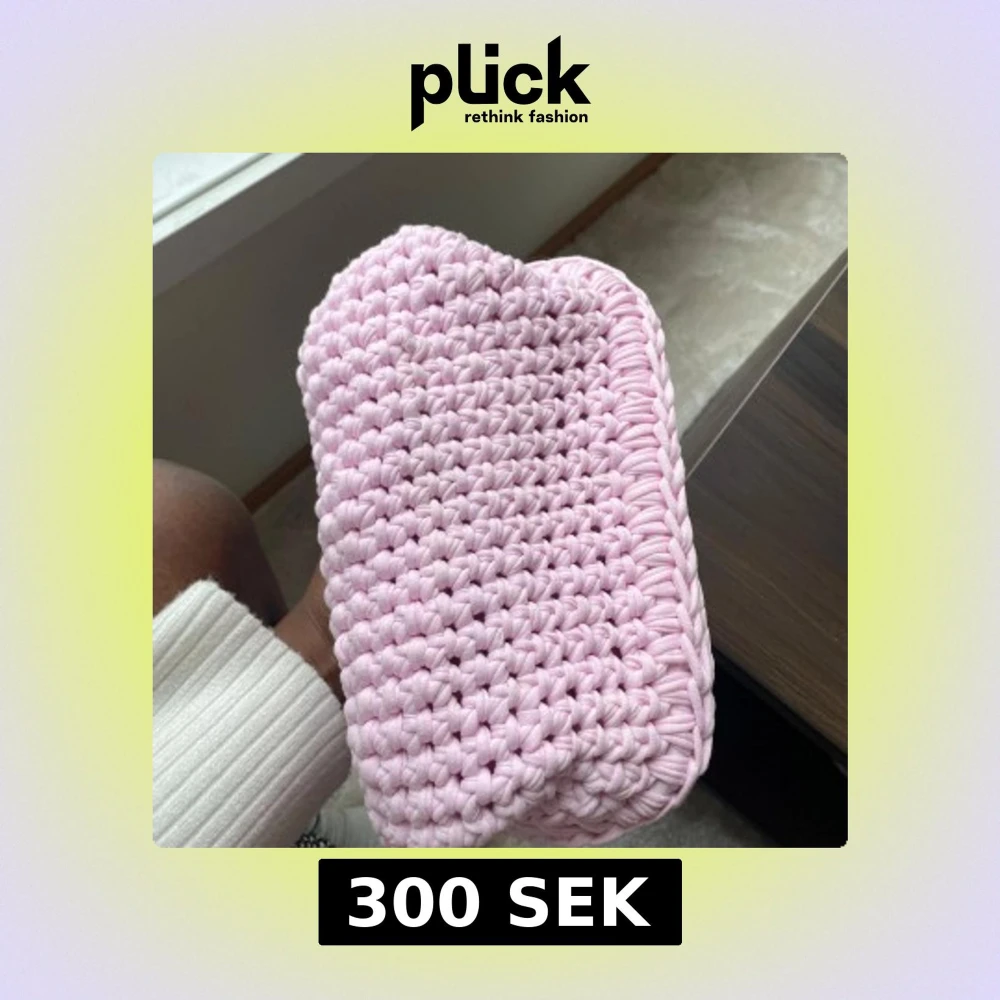 Supersöt handgjord kuvertväska i ljusrosa, virkad i tjockt garn med rektangulär form. Perfekt att bära småsaker i och ger en unik touch till din outfit. Väskan är mjuk och har en enkel öppning upptill.