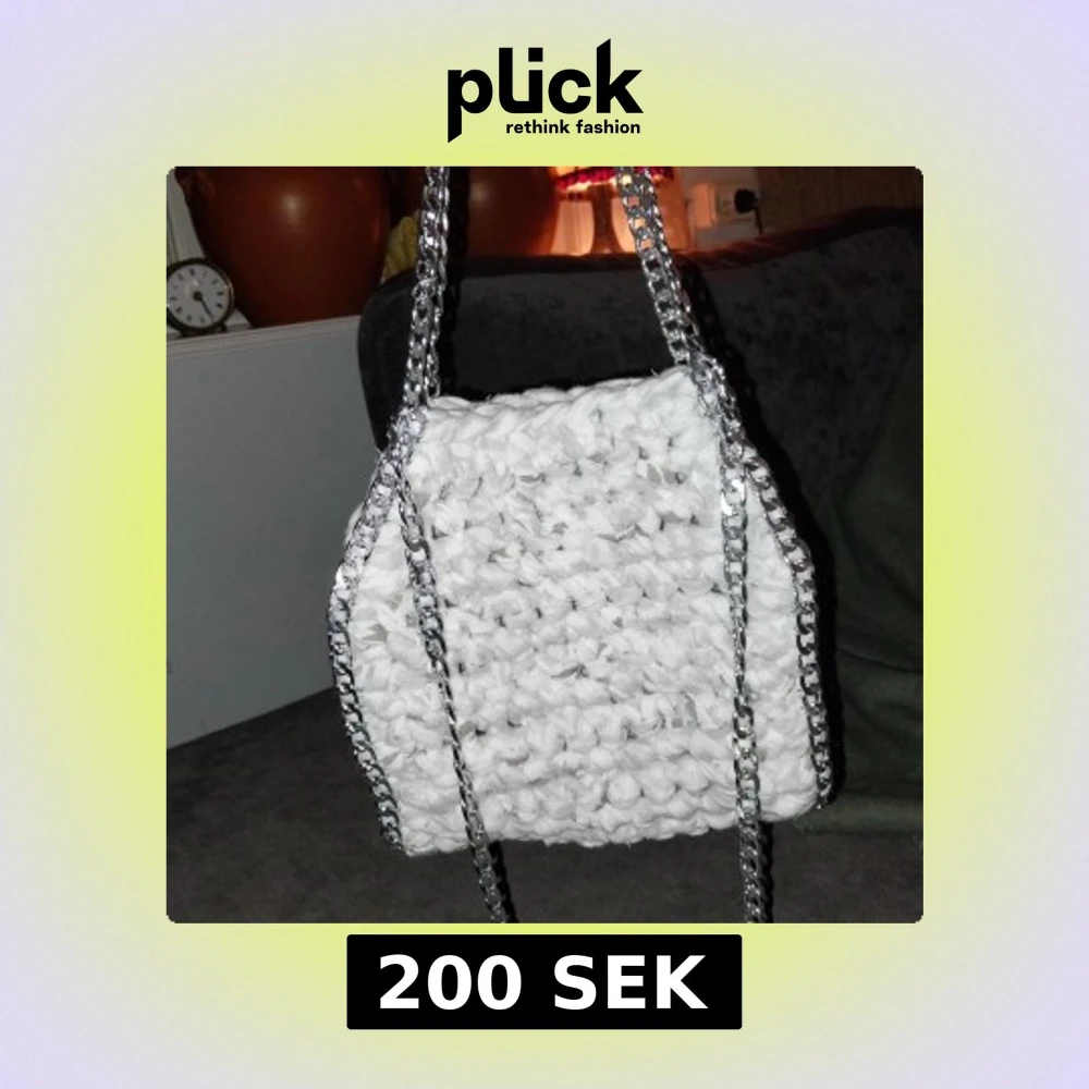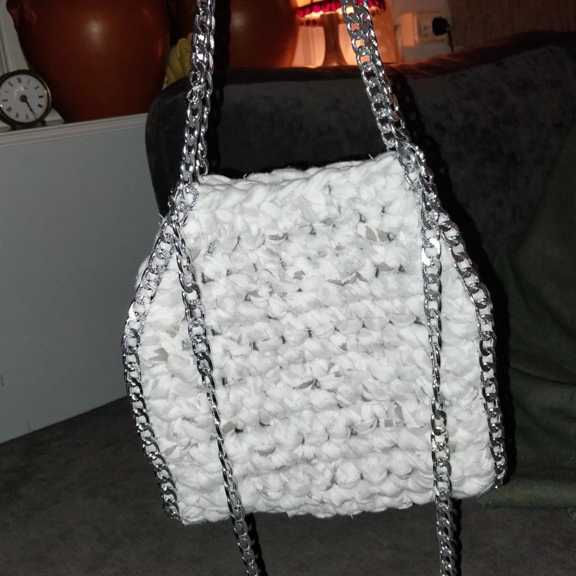 Snygg vit/grå spräcklig virkad väska med silverfärgade kedjedetaljer. Perfekt för att ge din outfit en unik touch. Väskan har en rektangulär form och är både stilren och praktisk.