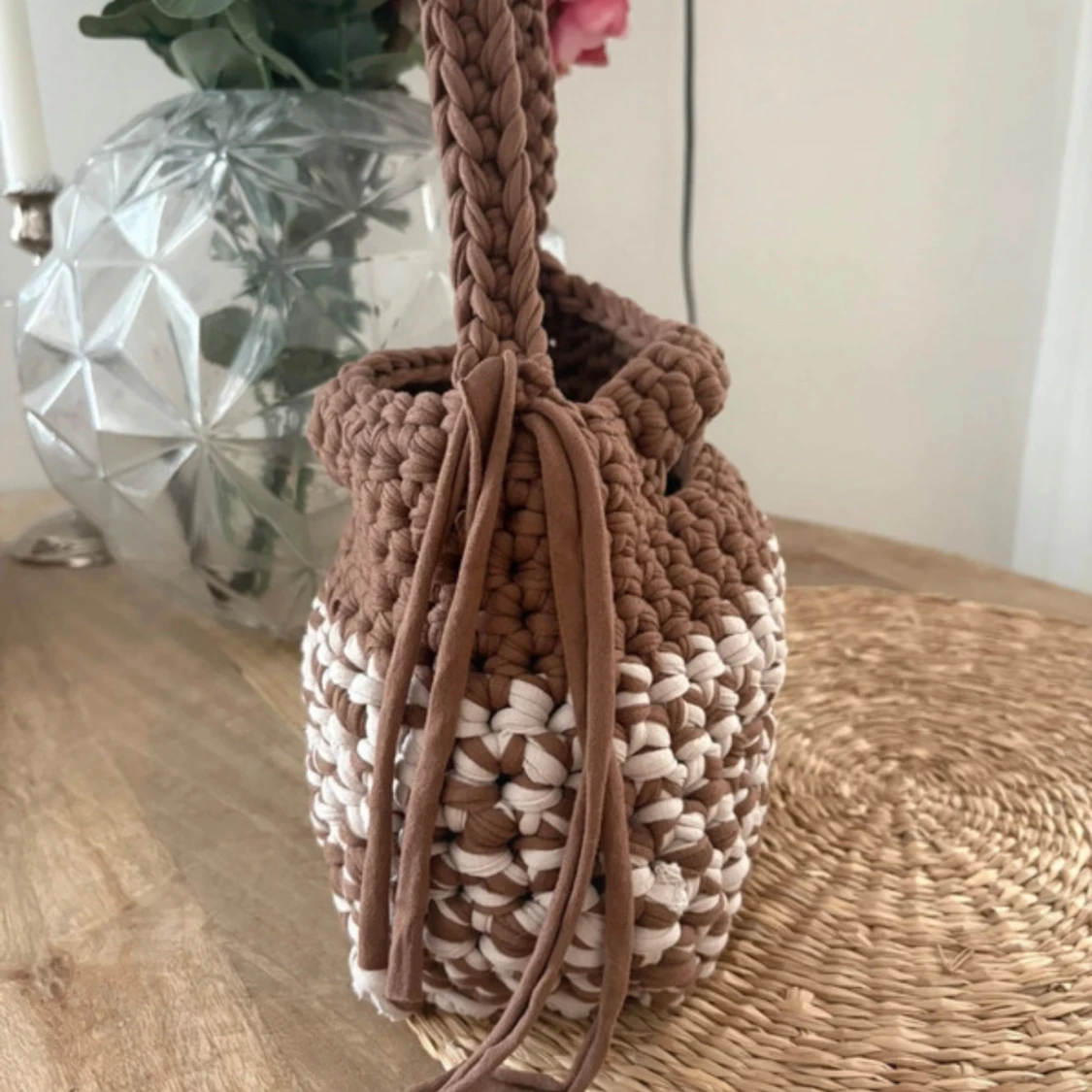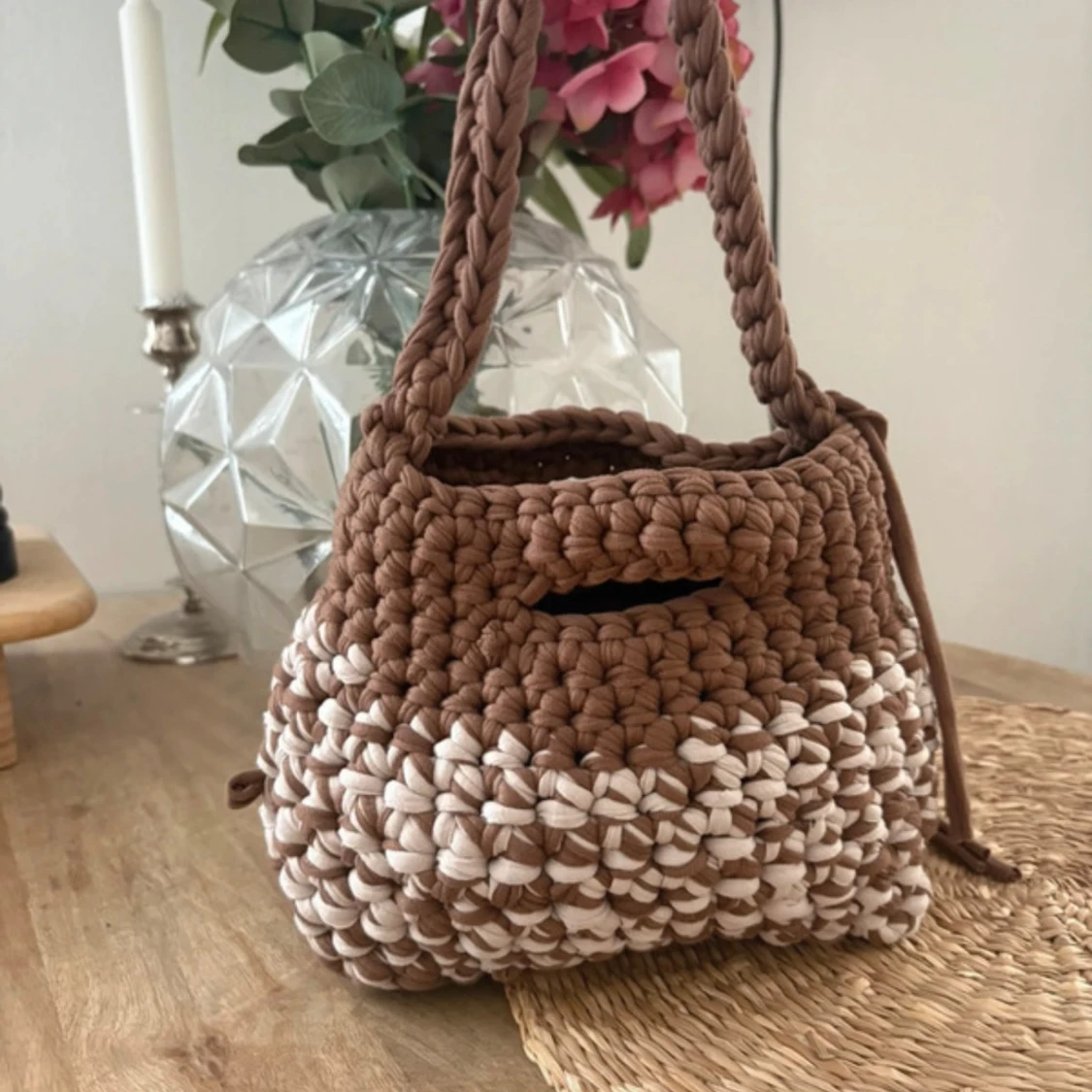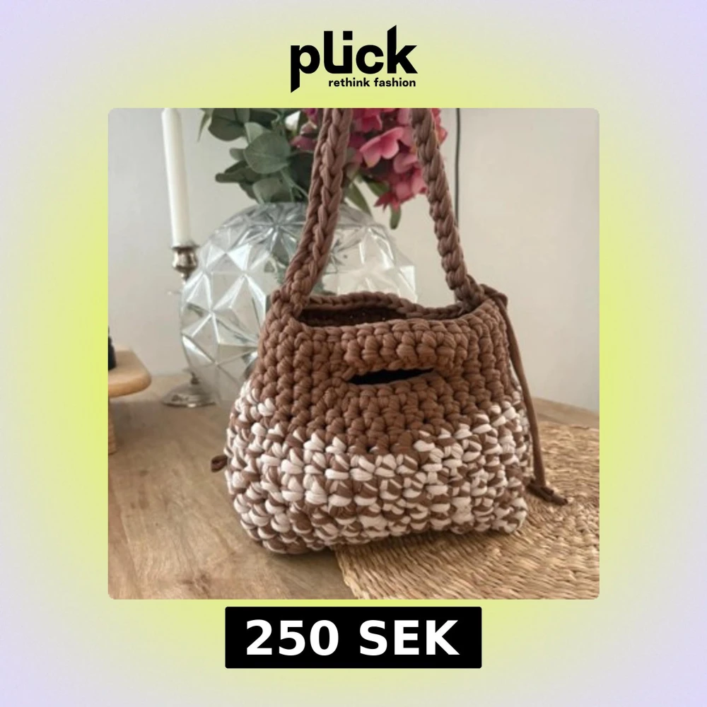 Superfin handgjord axelväska i grovt virkad bomull med tvåfärgat mönster i brunt och beige. Väskan har en stadig flätad axelrem och dragsko i sidan för att stänga väskan. Perfekt för dig som gillar unika accessoarer med boho-vibe.