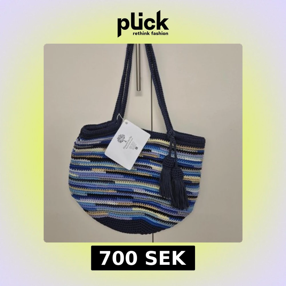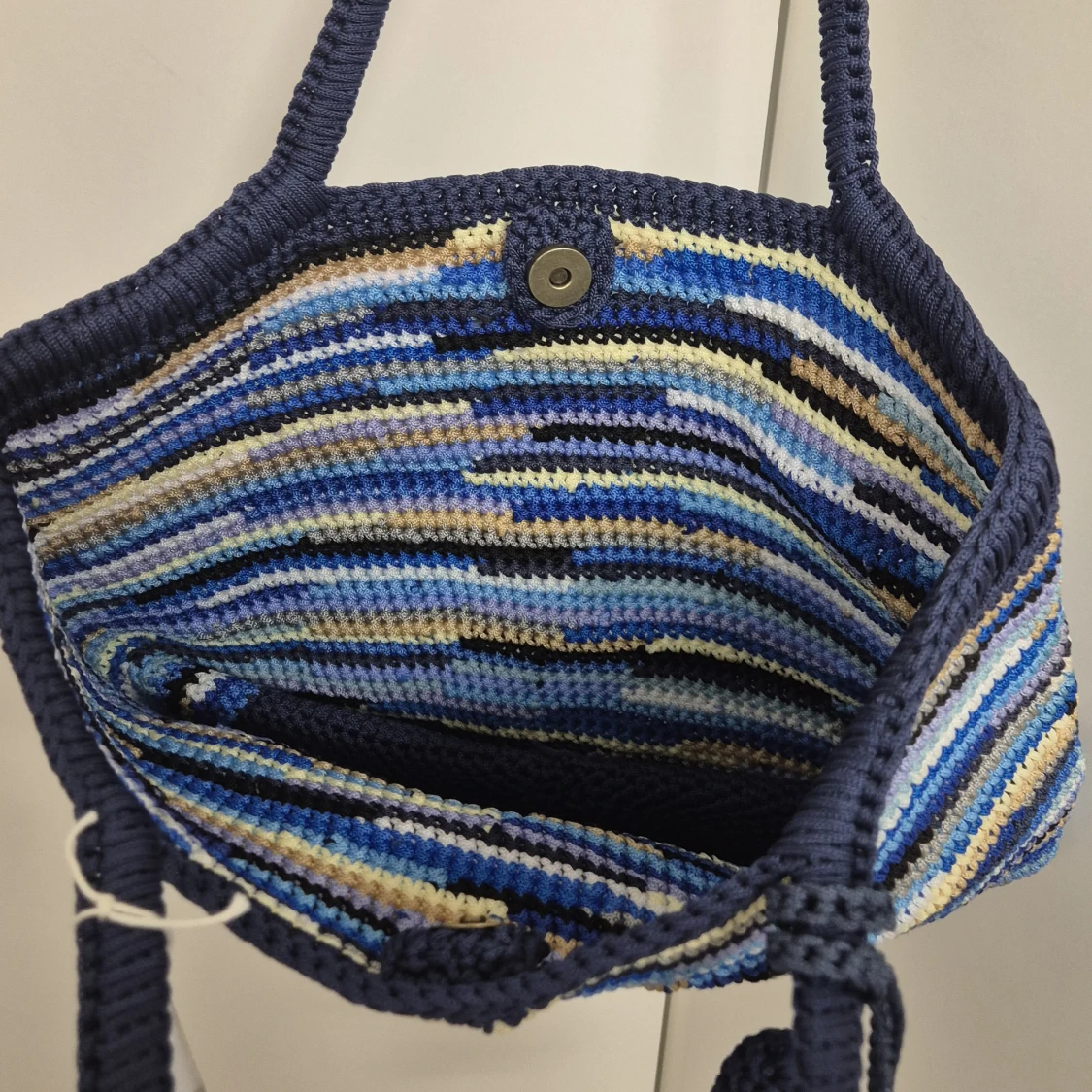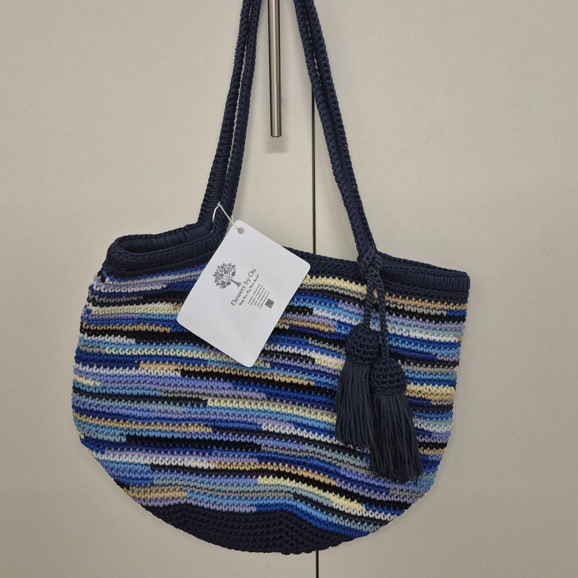 Superfin virkad axelväska från Flowers by Ou med randigt mönster i olika blå, gula och beige nyanser. Väskan har två rejäla axelband, dekorativa tofsar och stängs med magnetknapp. Perfekt för dig som gillar färg och unika accessoarer. Handmade i Thailand.