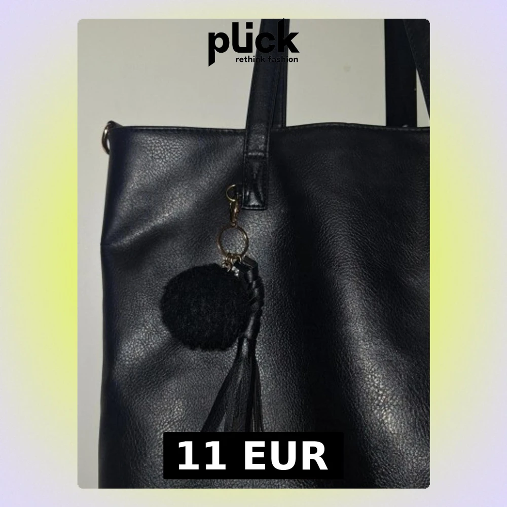 Sthlm stil stilren svart handväska i fejkläder med långa axelband. Väskan har en dekorativ nyckelring med en fluffig boll och svarta lädertofsar. Perfekt för dig som gillar enkel men trendig design. Rymlig modell som rymmer det mesta du behöver. Passar som t ex. en skolväska, när man ska resa, weekend bag etc.
