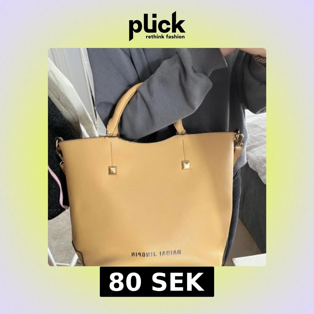 Stilren beige handväska med både handtag och avtagbar axelrem. Väskan har guldfärgade detaljer och fyrkantiga nitar framtill. Perfekt för att bära dina vardagsprylar med stil.