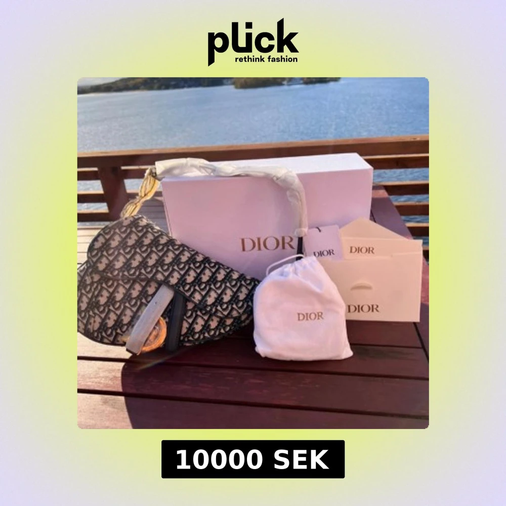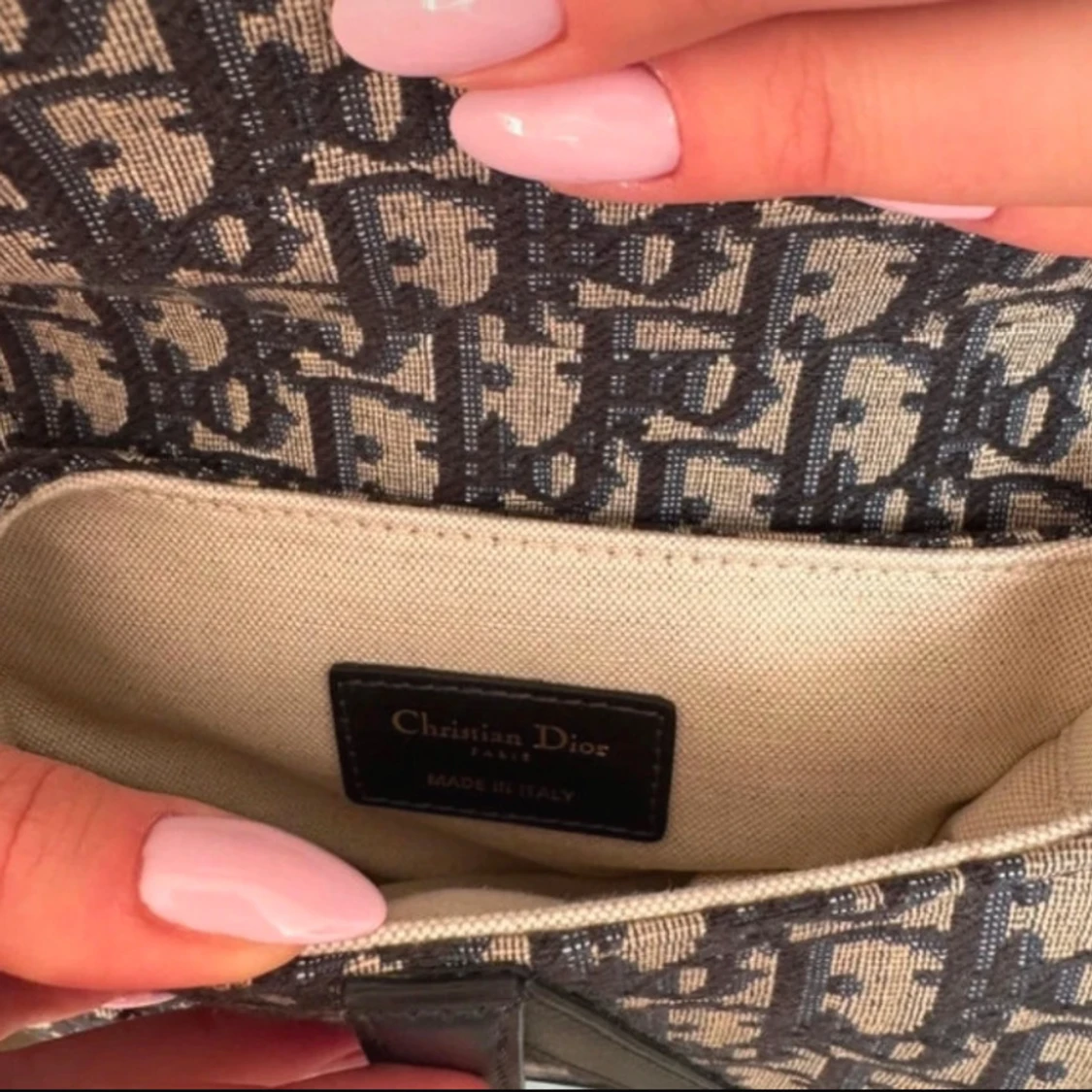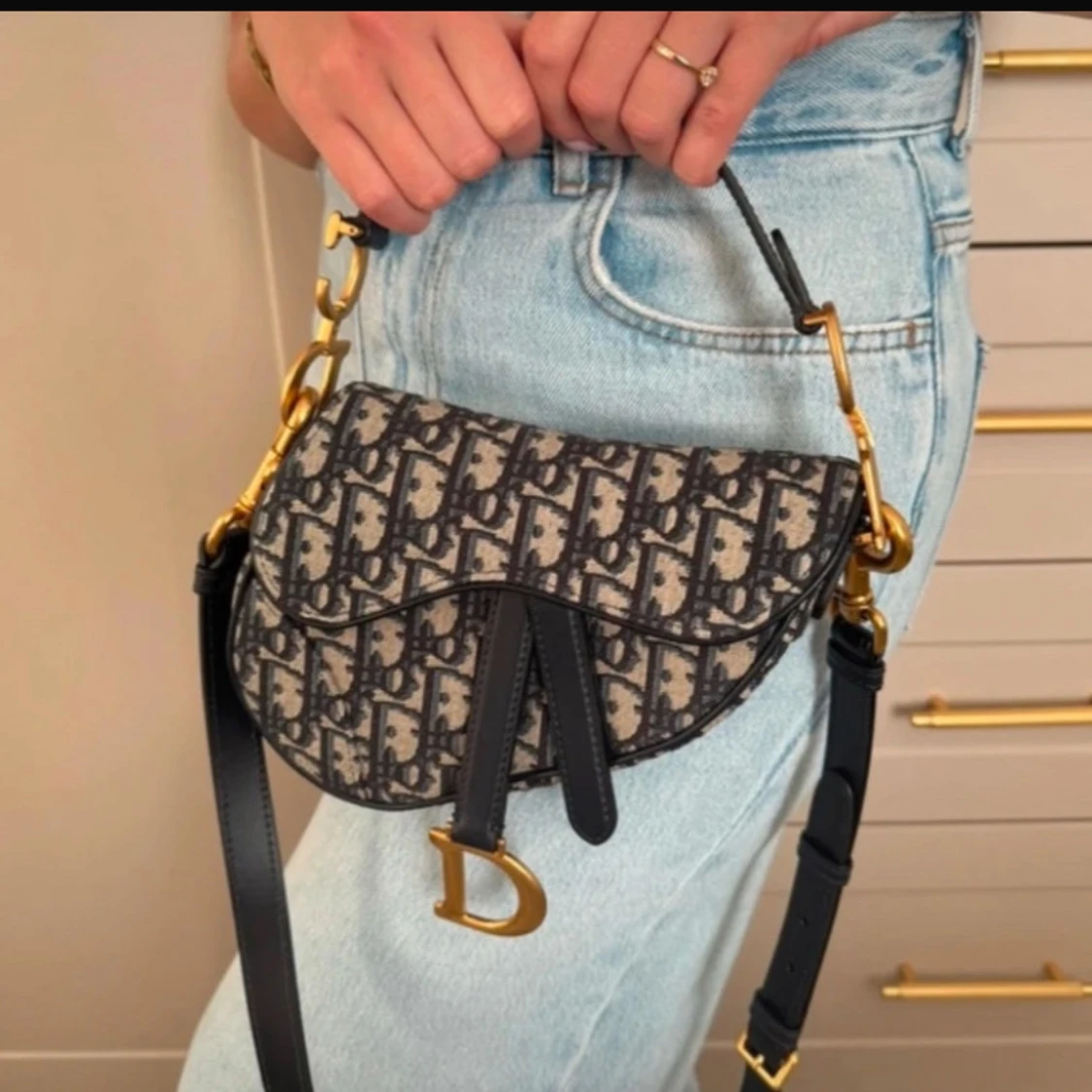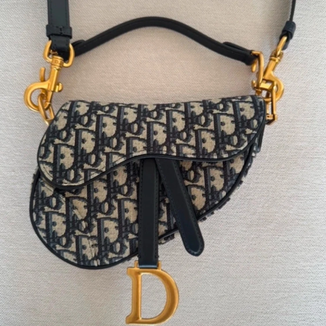 Säljer en ikonisk Dior Saddle Bag med monogrammönster i mörkblått och beige canvas, detaljer i svart skinn och guldiga metalldetaljer. Väskan har justerbar axelrem och stort D-hänge framtill. Perfekt statement piece för dig som vill sticka ut.
