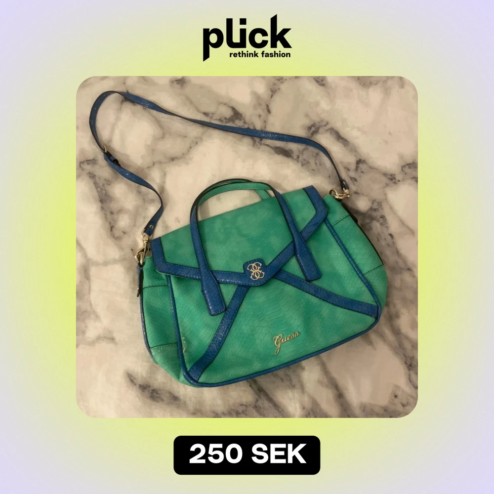 Slt handväska från Guess i en cool kombination av grönt och blått. Väskan har ett ormskinnsmönster och är dekorerad med Guess-loggan i guld. Den har både handtag och en avtagbar axelrem, vilket gör den superpraktisk. Perfekt för både vardag och fest! 💚DM vid frågor osv!