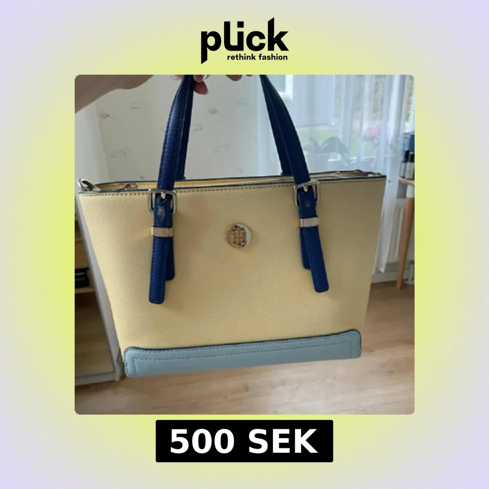 Snygg handväska från Tommy Hilfiger i ljusgul och ljusblå färg med mörkblå handtag. Väskan har ett stilrent TH-emblem i guld på framsidan och dragkedja upptill. Materialet är syntet med slät finish och detaljer i metall. Perfekt storlek för vardagsgrejer.