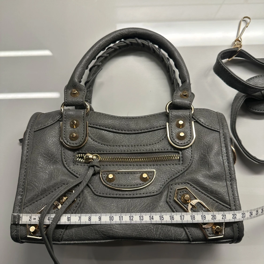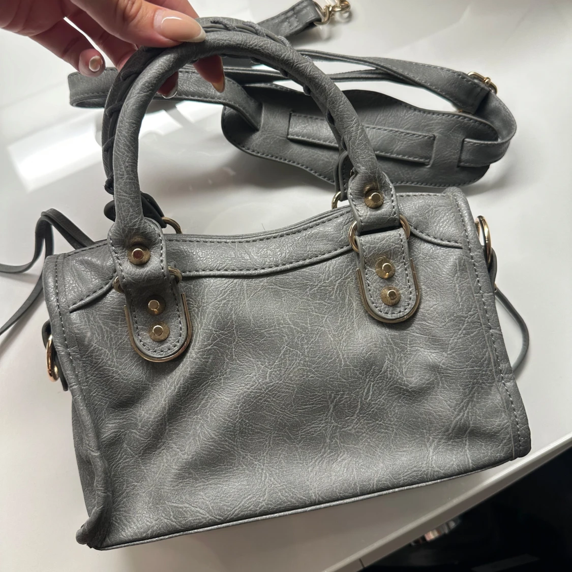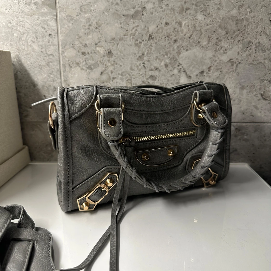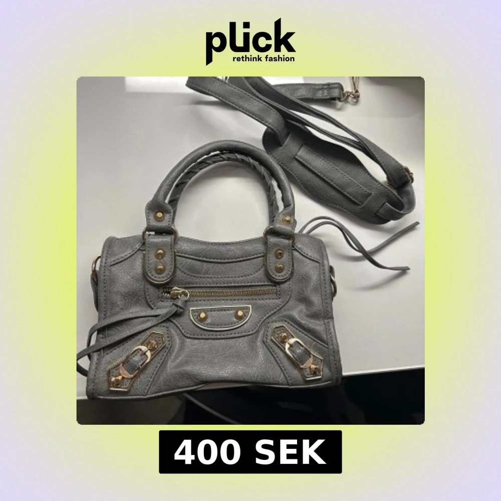 Snygg grå handväska med guldfärgade metalldetaljer och dekorativa nitar. Väskan har både handtag och en avtagbar axelrem, samt en praktisk dragkedja framtill. Perfekt storlek för det viktigaste! Aldrig använd 👜