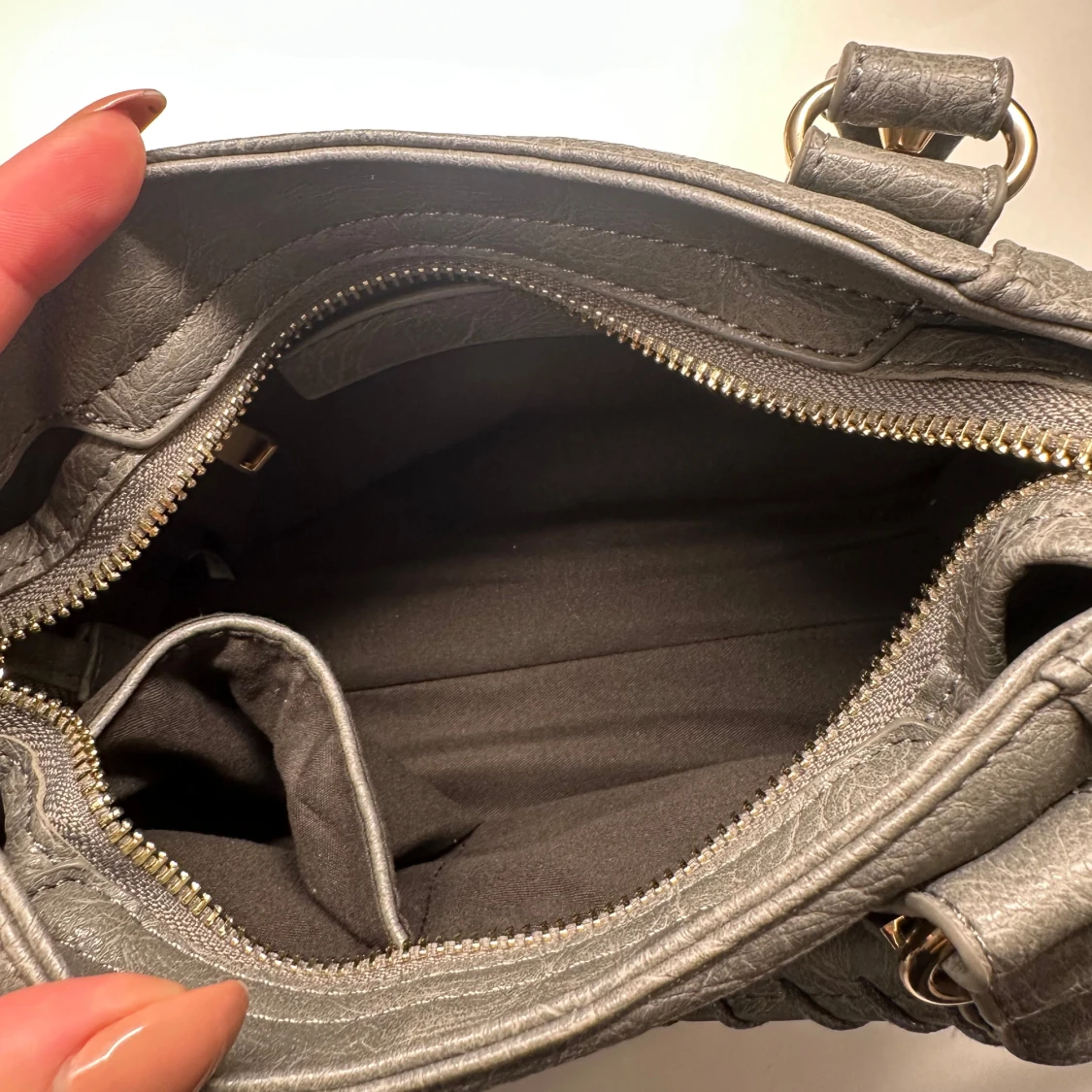 Grå handväska med gulddetaljer
