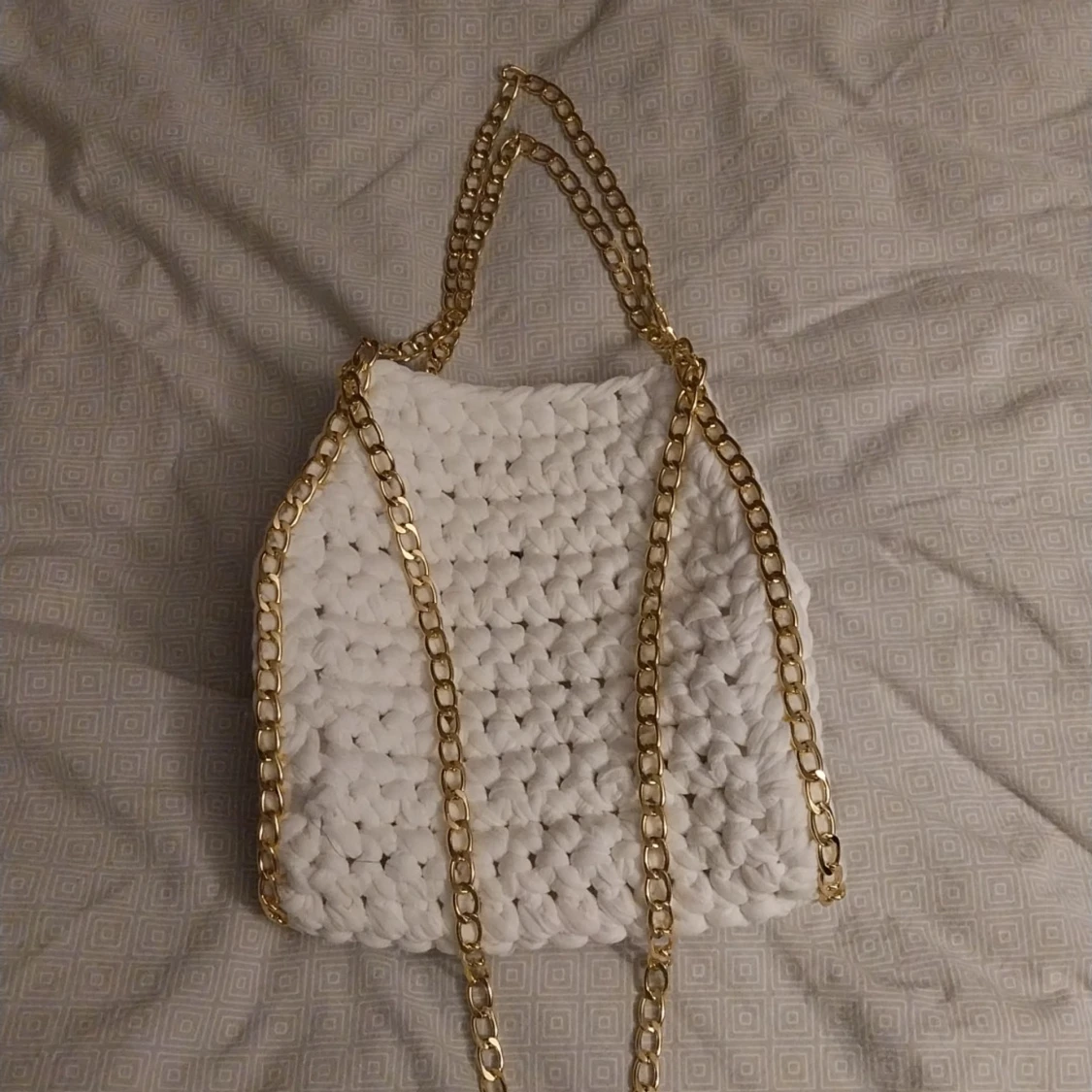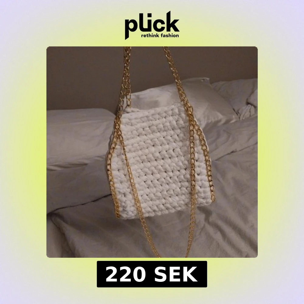 Snygg vit virkad väska med en elegant guldkedja. Perfekt för att ge din outfit en trendig touch. Väskan har en unik virkad design som gör den både stilren och iögonfallande.