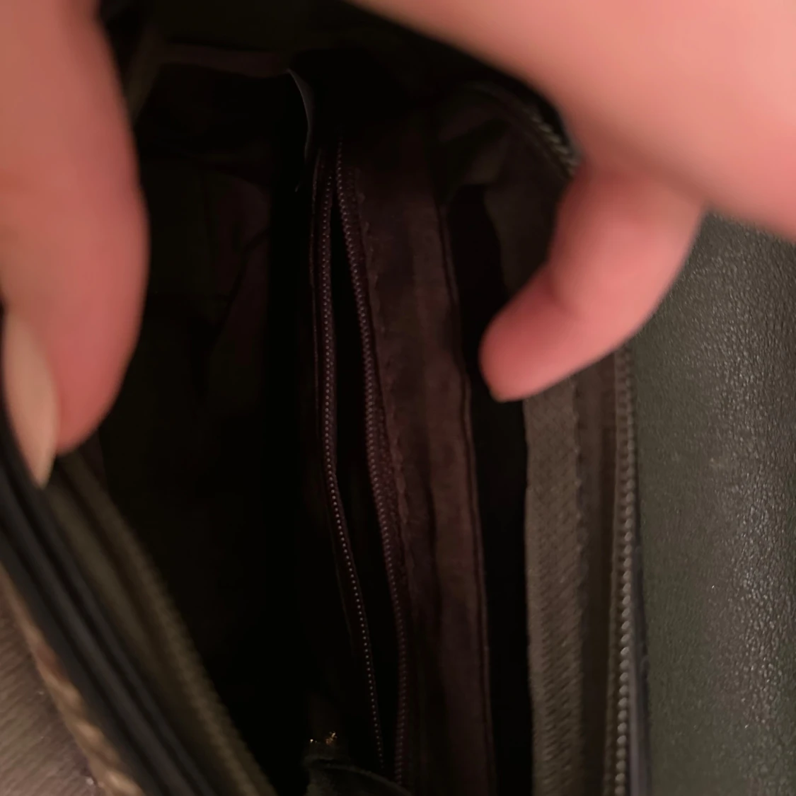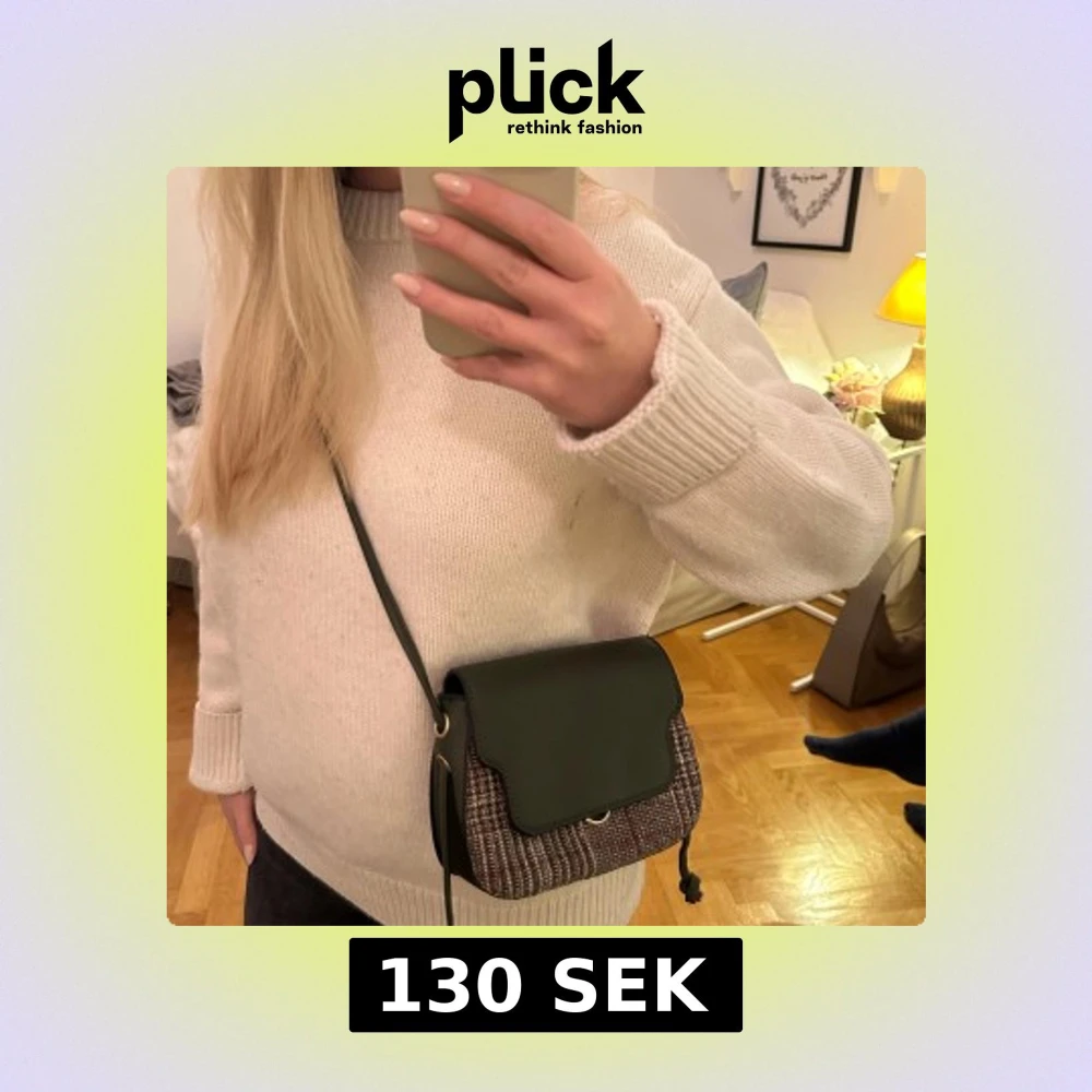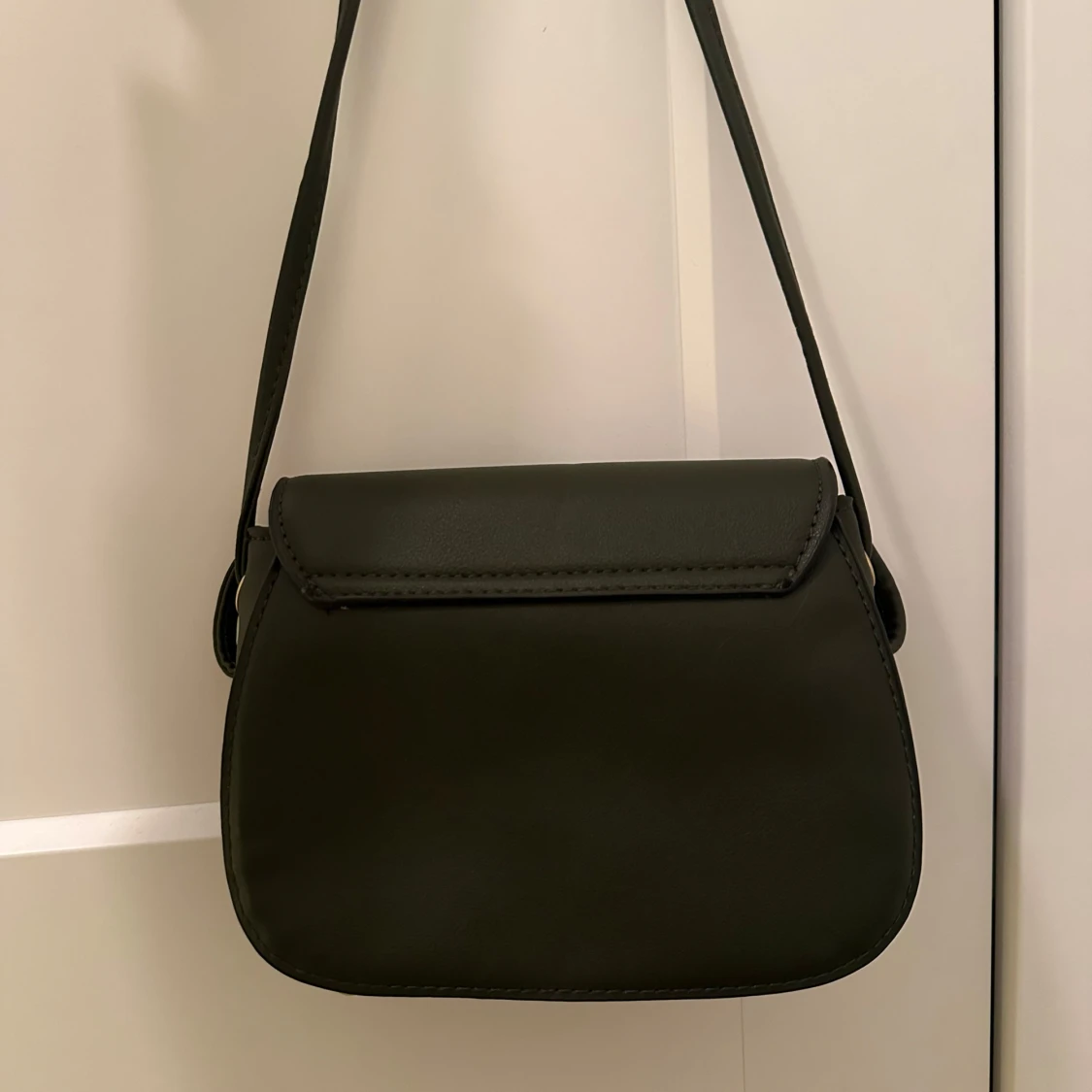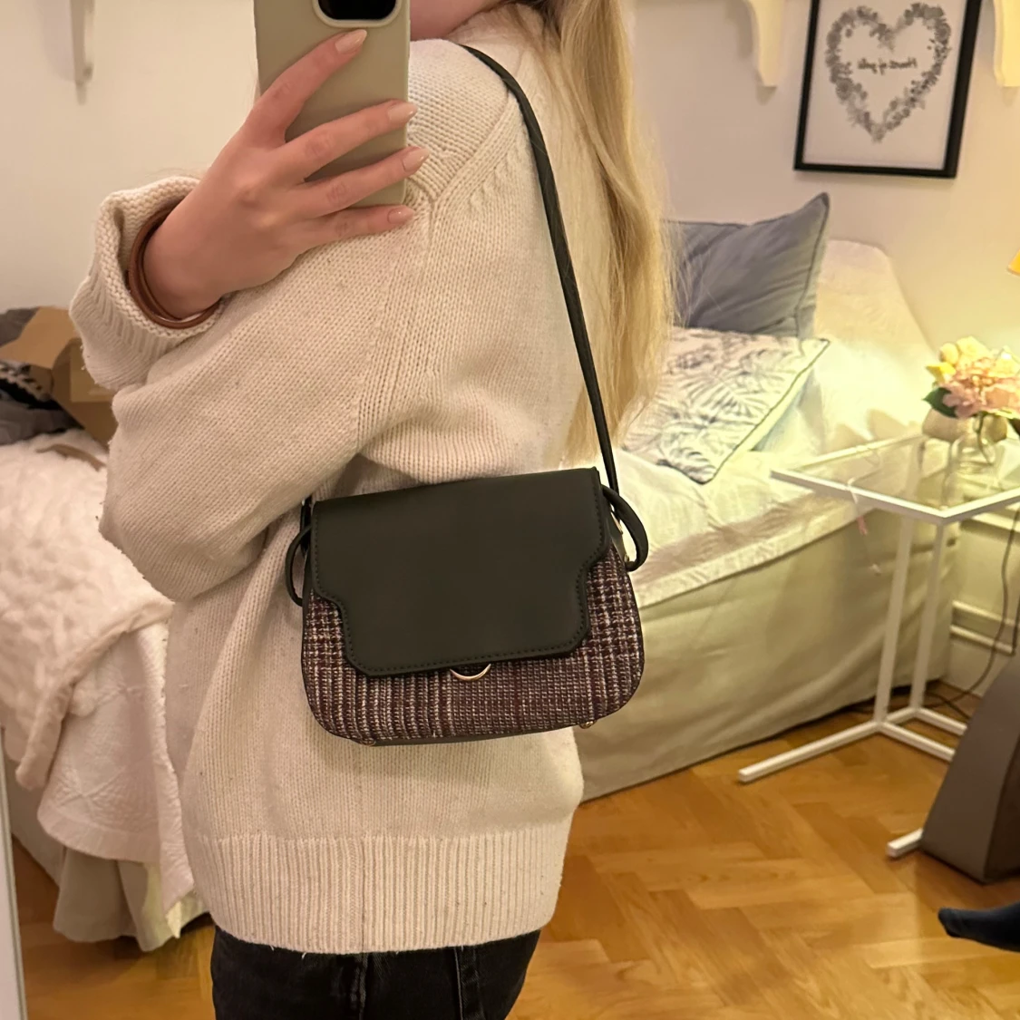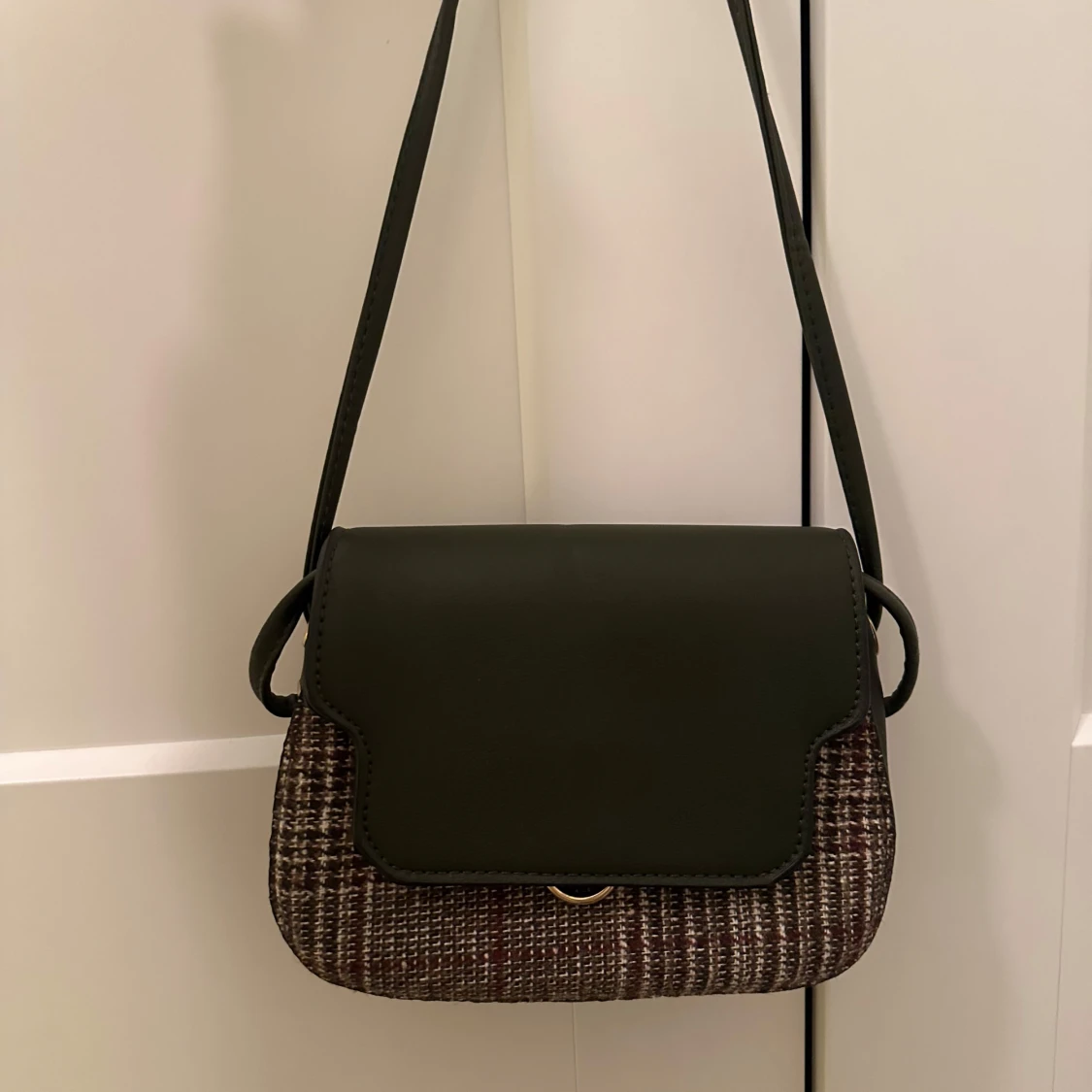 Snygg axelväska med en kombination av mörkgrönt lock och mönstrad kropp. Väskan har en justerbar axelrem och en praktisk storlek för vardagsbruk.