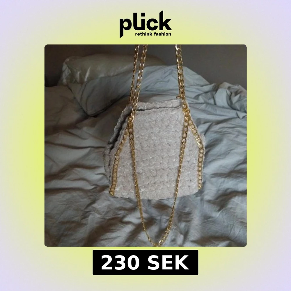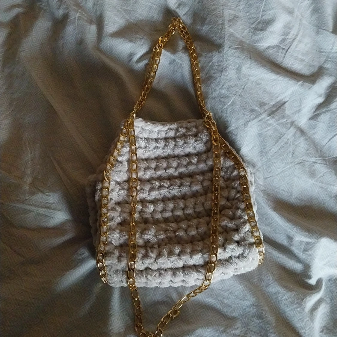 Snygg beigegrå virkad väska med en elegant guldkedja. Väskan har en unik textur och är perfekt för att ge din outfit en trendig touch. Perfekt för att bära dina nödvändigheter med stil.