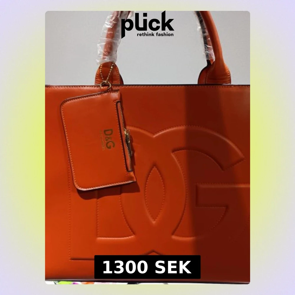 Snygg orange handväska från med stor präglad logga på framsidan och matchande liten plånbok med dragkedja. Väskan har två robusta handtag och är tillverkad i slätt skinnmaterial. Perfekt för dig som gillar stilrena och trendiga accessoarer.