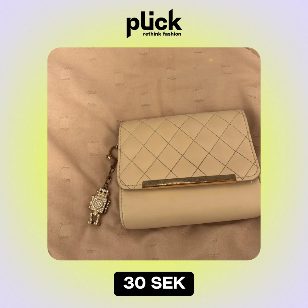 SĂ€ljer en superfin beige hand vĂ€ska,men man kan lĂ€gga en kedja. Den har en söt liten robotberlock som hĂ€nger pĂ„ sidan.HandvĂ€skan Ă€r i mycket bra skick och har en stilren design med en metallisk detalj pĂ„ framsidan.đ