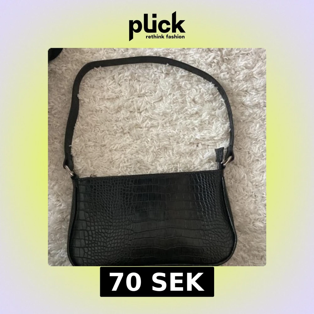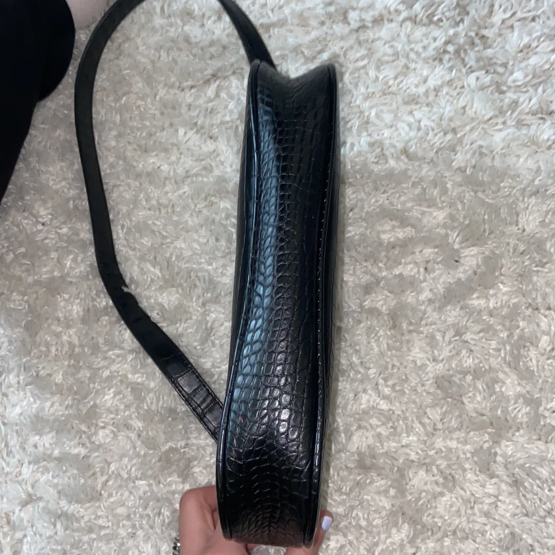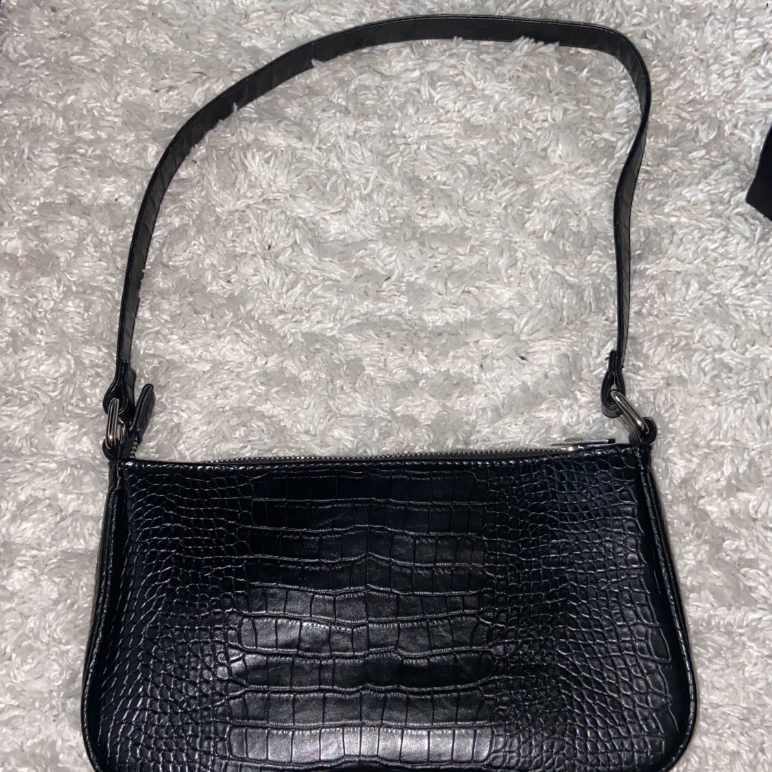 Snygg svart axelväska med krokodilmönster och dragkedja. Perfekt för att ge en stilren touch till din outfit. Väskan har en axelrem och är tillverkad i syntetmaterial. Ett stort fack med drajkedja använt några få tal gånger ute. Köpte väskan på Ullared gekås.