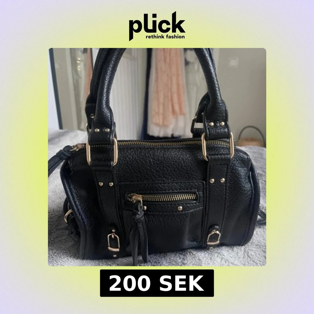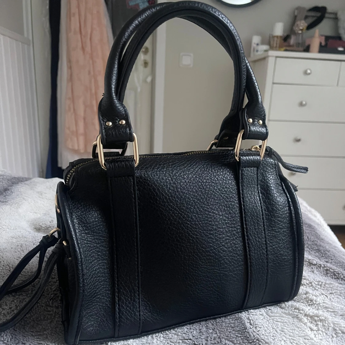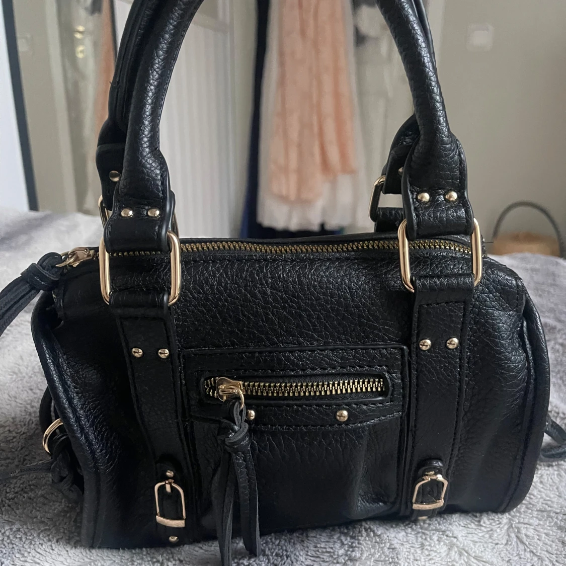 Snygg svart handväska med gulddetaljer. Knappt använd så den är som ny.