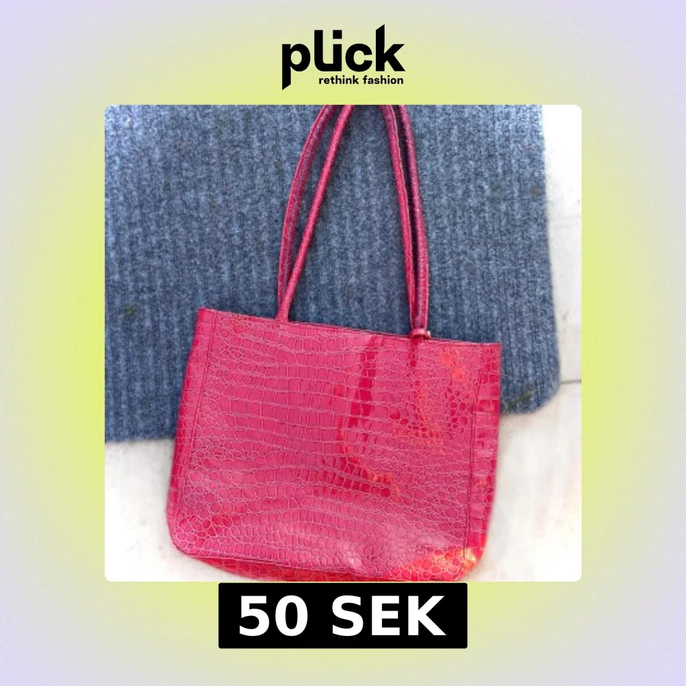 Säljer en röd axelväska med croco-mönstrad yta och långa handtag. Väskan har magnetlås och är rymlig nog för både laptop och böcker.