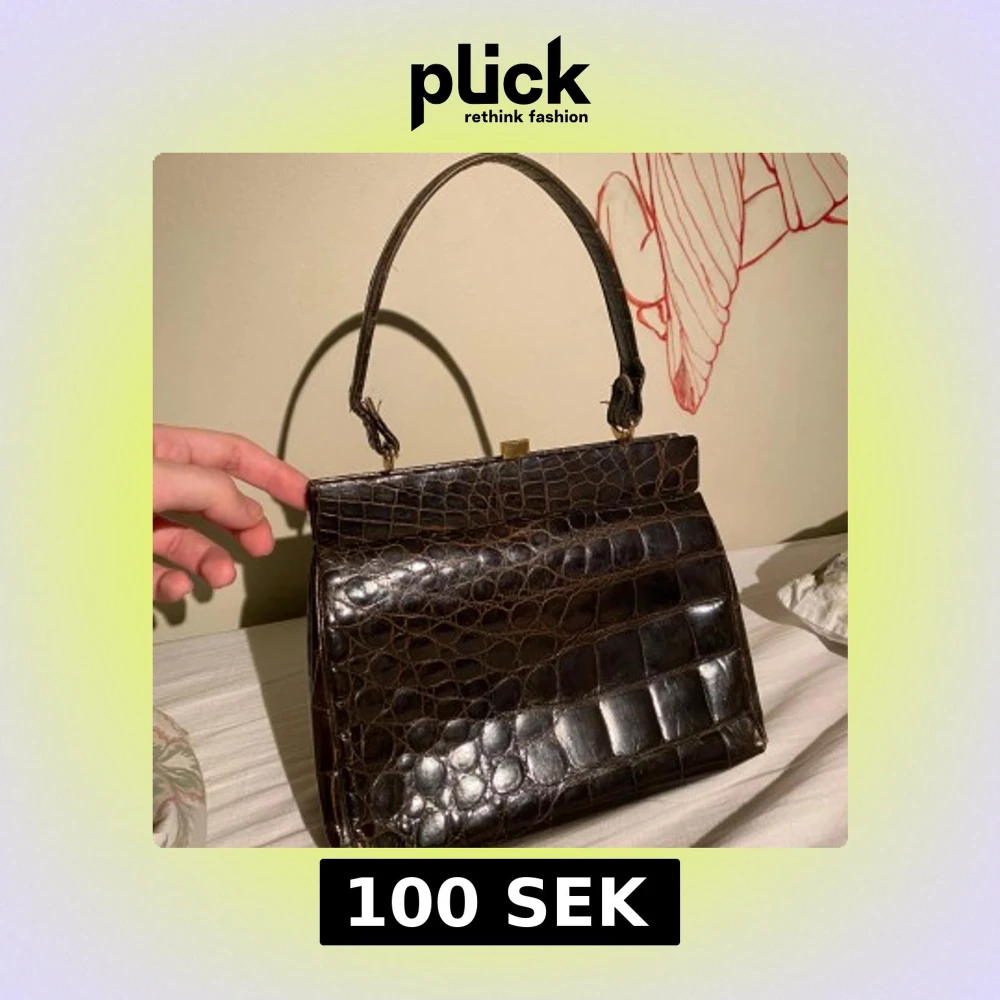 Brun handväska med krokodilskinns mönster. Insidan har fyra fack av olika storlekar. Skinn / läder
