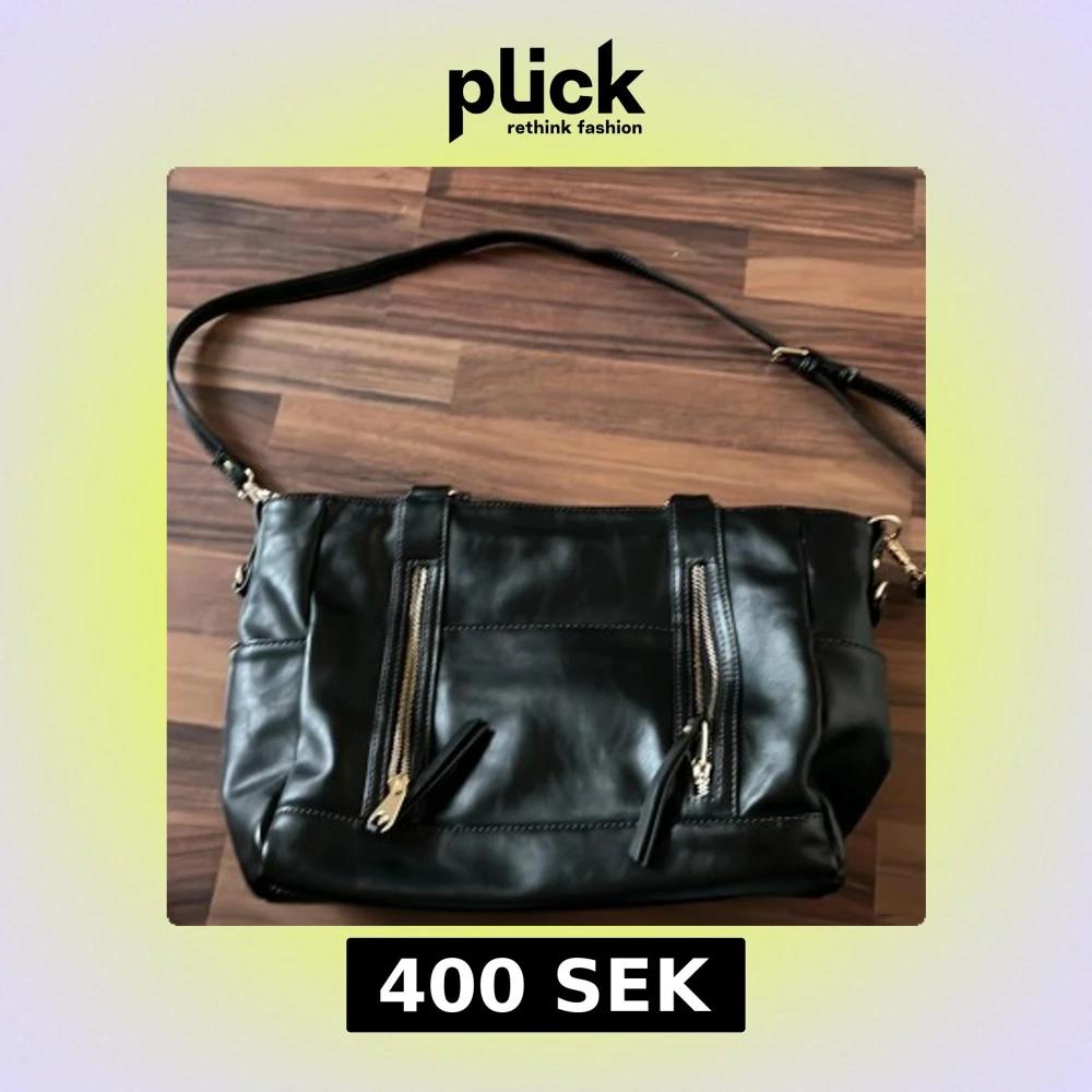 Snygg svart axelväska i skinn med både handtag och justerbar axelrem. Väskan har två dekorativa dragkedjor framtill och en extra ficka med dragkedja på baksidan. Perfekt storlek för att få plats med allt du behöver och stilrena detaljer i guld.