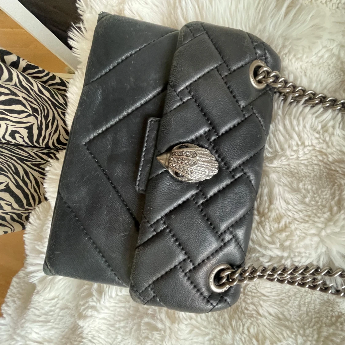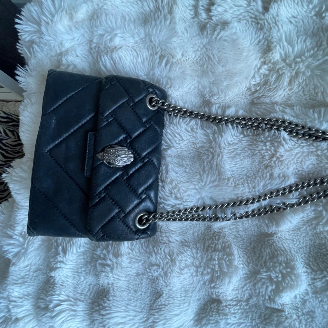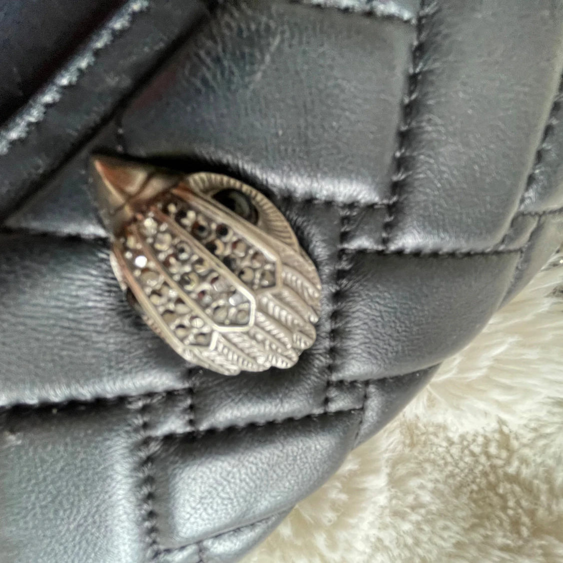 Snygg svart quiltad axelväska från Kurt Geiger med silverfärgad kedjerem och ikoniskt örndekor på locket. Väskan är tillverkad i skinn och har ett lyxigt mönstrat innerfoder. Köpt i London på deras butik i Harrods. Köpte då med euro för cirka 2 år sedan men översatt var nypriset kring 3500kr. Lite tecken på användning men inte sliten. Skulle nog kunna hitta dustbag och annat äktehetsbevis vid önskan🥰