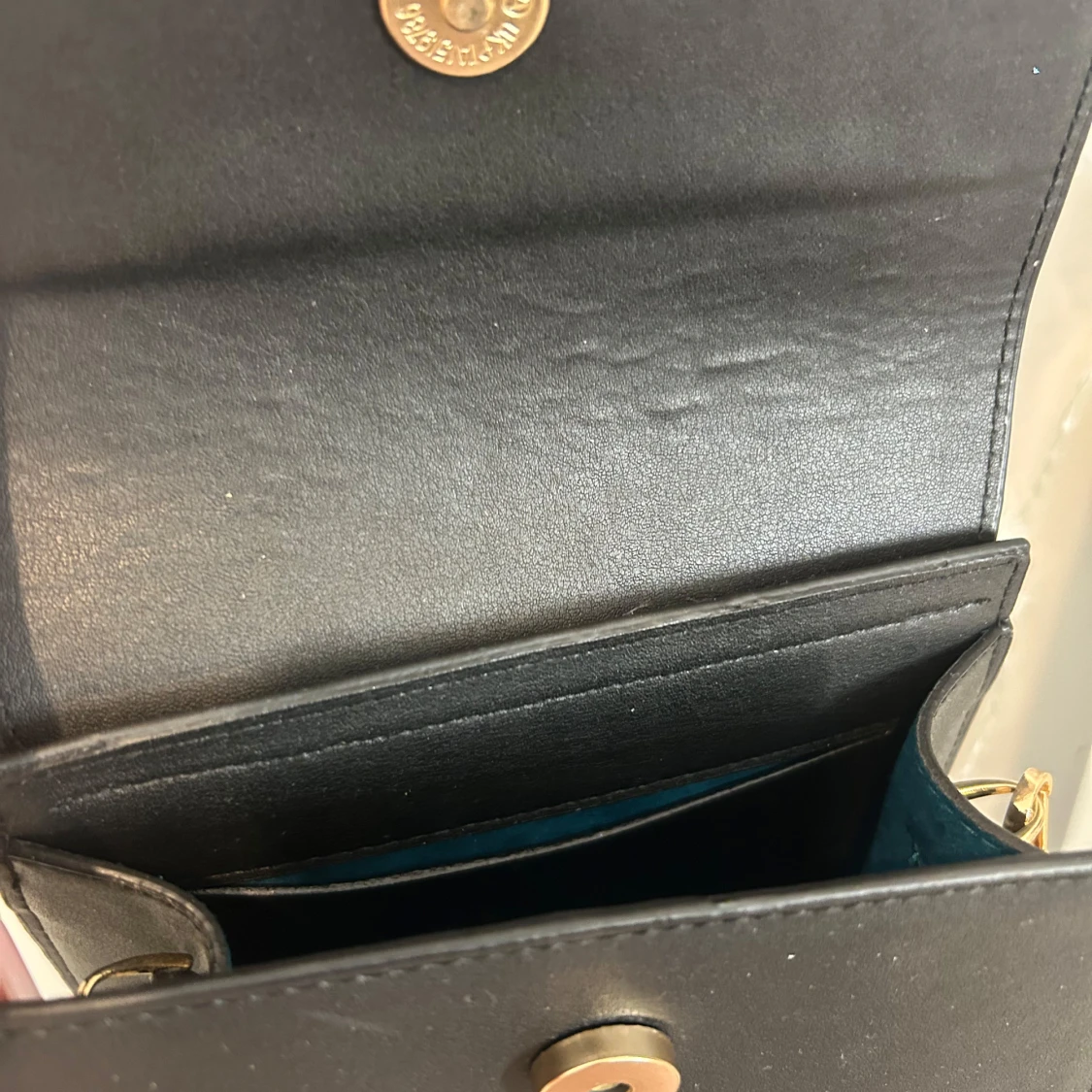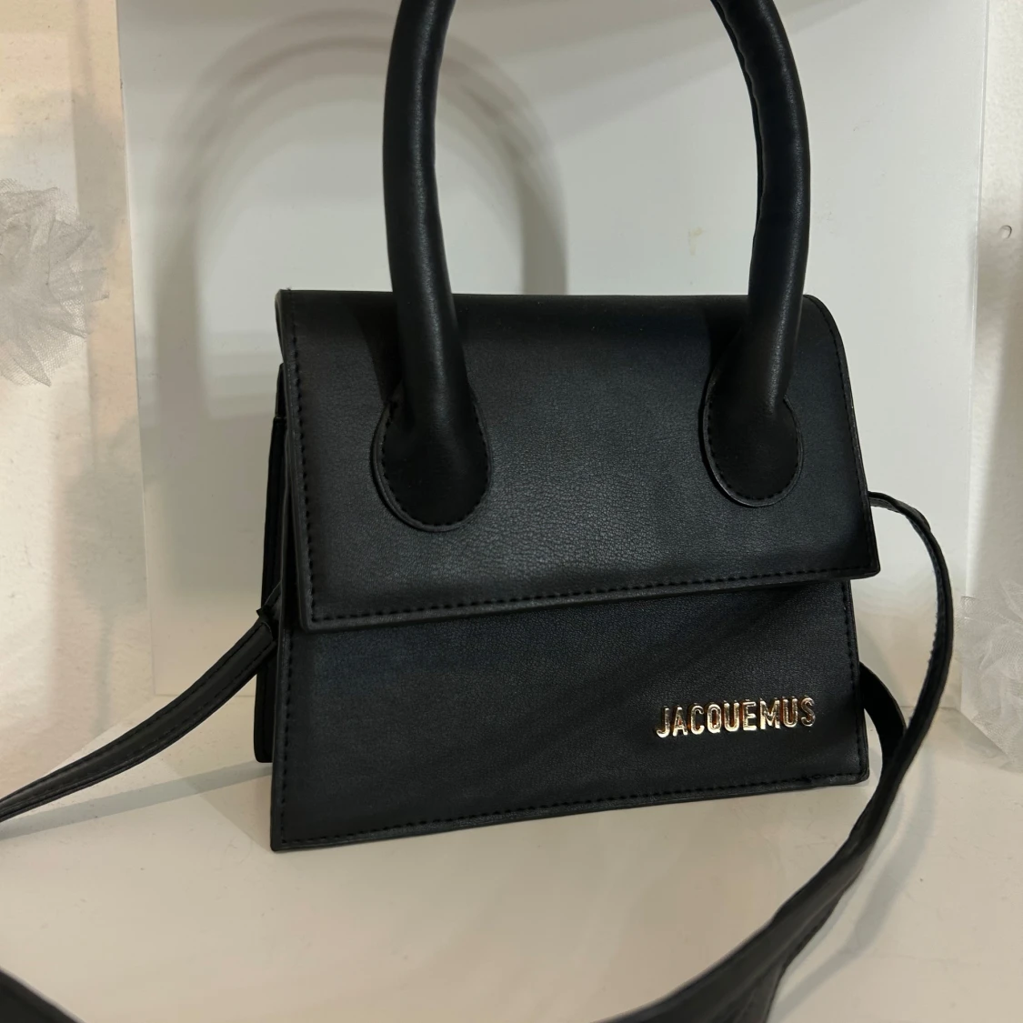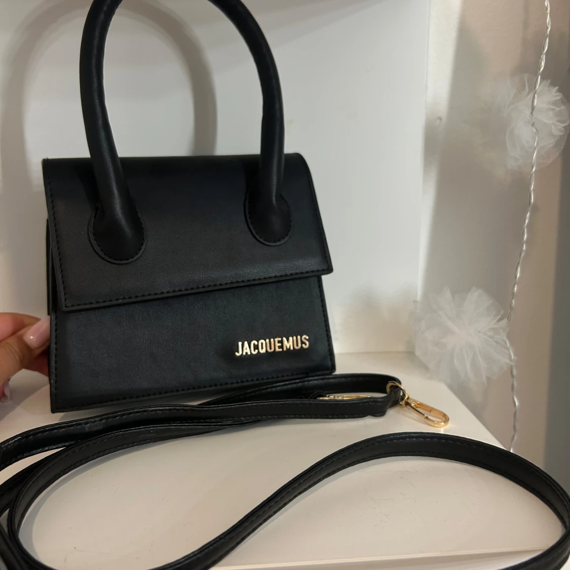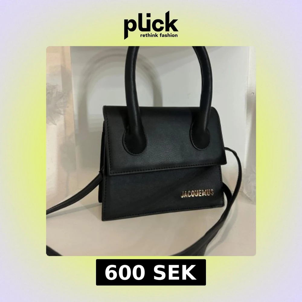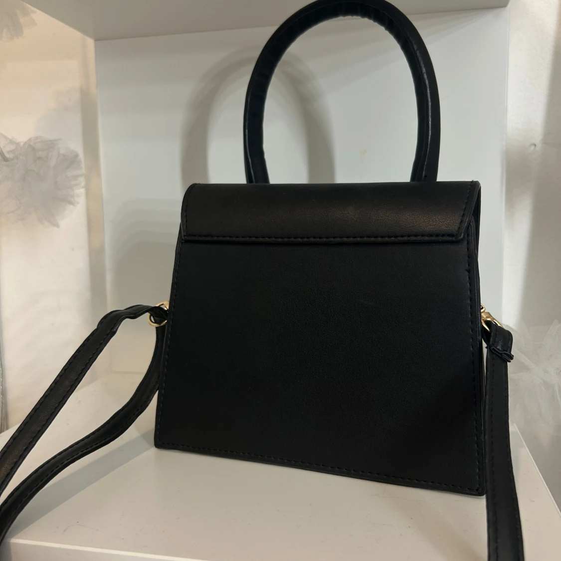 Snygg svart handväska med stilren, boxig form och guldfärgad logga framtill. Väskan har både handtag och en avtagbar axelrem. Magnetlås och ett fack inuti gör den både praktisk och trendig.