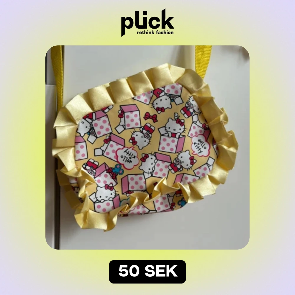 Supersöt väska med Hello Kitty-motiv. Stängs med dragkedja. Gul lång axelrem. Storlek 20x15 cm.
