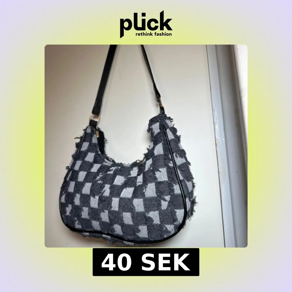 Snygg axelväska med ett unikt rutigt mönster i grått och svart. Väskan har en fransig design och en praktisk dragkedja 🖤🩶