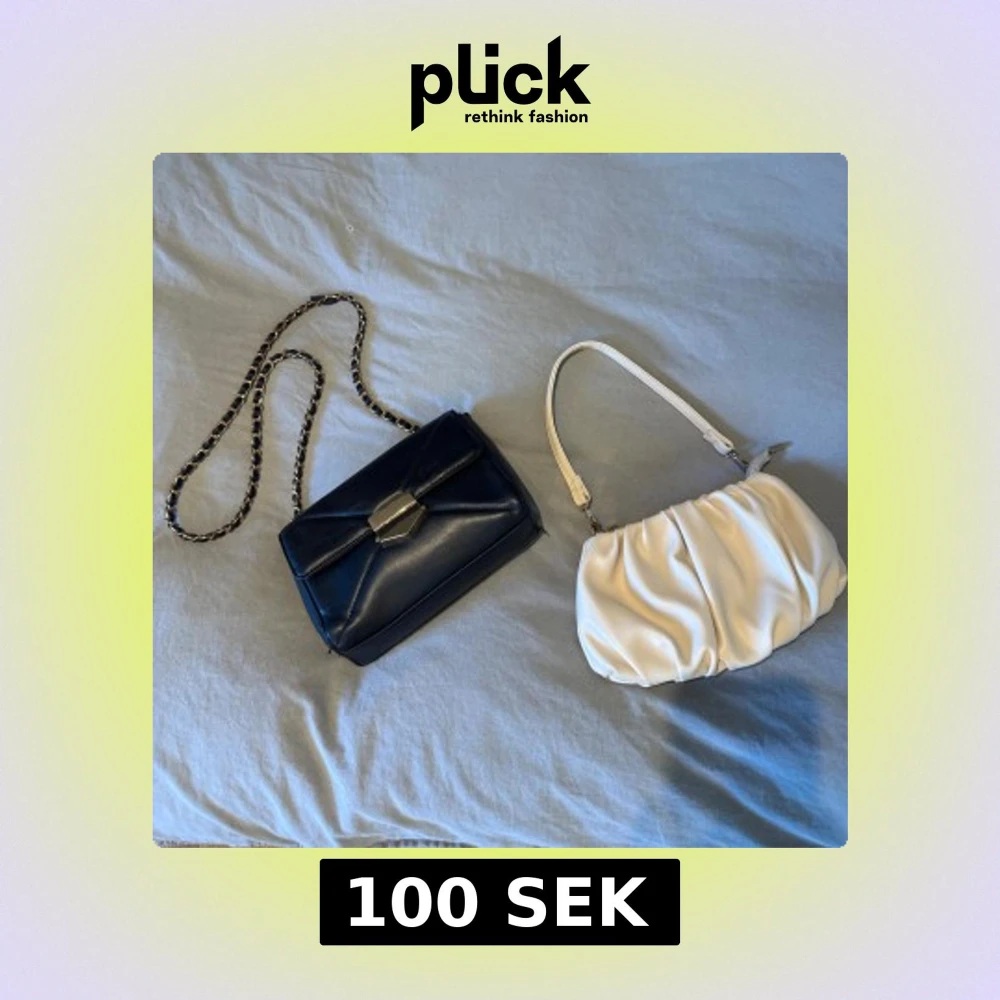 Två stiliga väskor till salu! En svart axelväska med kedjedetalj och metallspänne, perfekt för en elegant look. Den andra är en beige handväska med mjukt, veckat material.