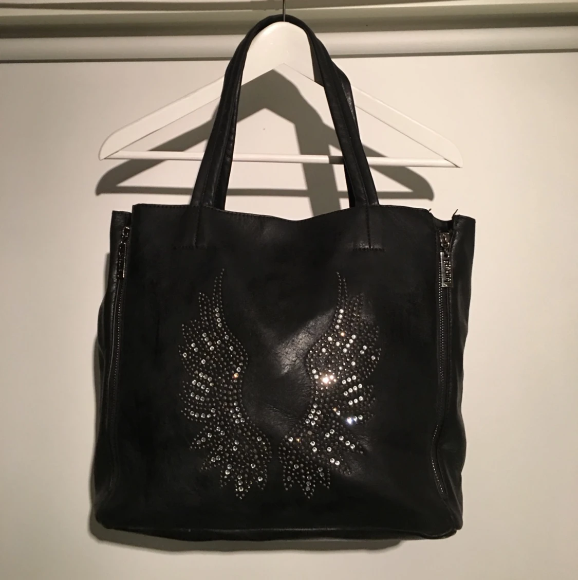 Svart handväska med vingar i strass, dragkedjor i sidorna.