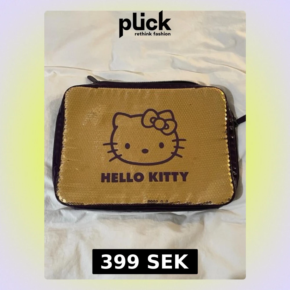 Datorväska guldig med paljetter från Hello Kitty med lila kanter. Köpt på sellpy för 500kr. Funkar för en vanlig Apple dator. Fråga om mått så fixar jag