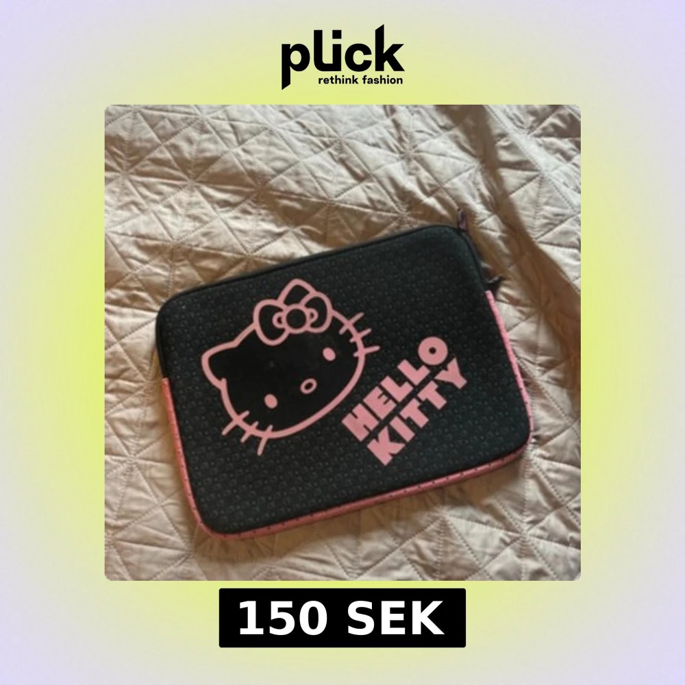 Säljer en svart datorväska från Hello Kitty med rosa detaljer och stort Hello Kitty-tryck på framsidan. Väskan har dragkedja och är dekorerad med små Hello Kitty-mönster över hela ytan. Perfekt för dig som vill ha en söt och unik look till din laptop.