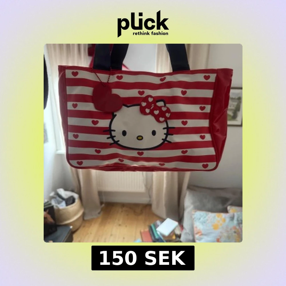 Säljer en superfin Hello Kitty väska med röd och vit randigt mönster och små hjärtan. Väskan har ett stort Hello Kitty-ansikte på framsidan och en söt rosett. Den har svarta handtag och en charmig hjärtformad tagg. Perfekt för alla Hello Kitty-fans! 🐱❤️