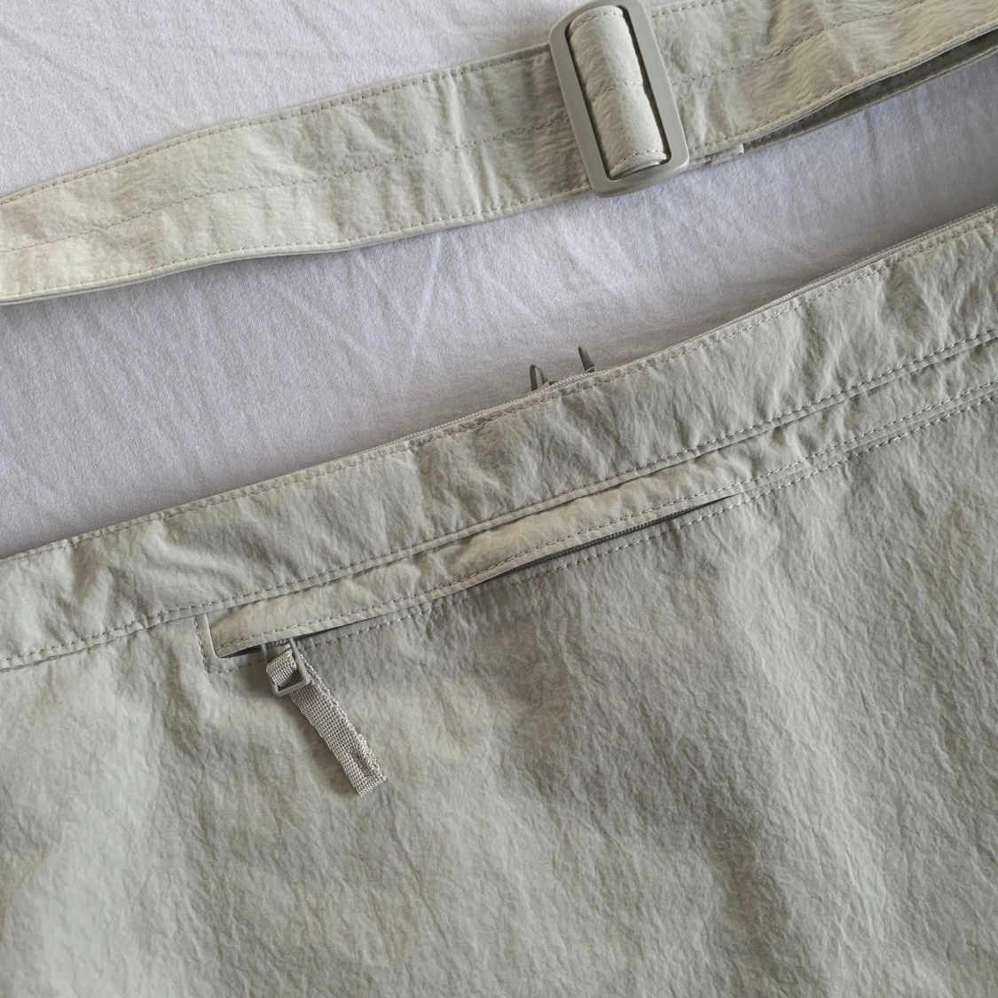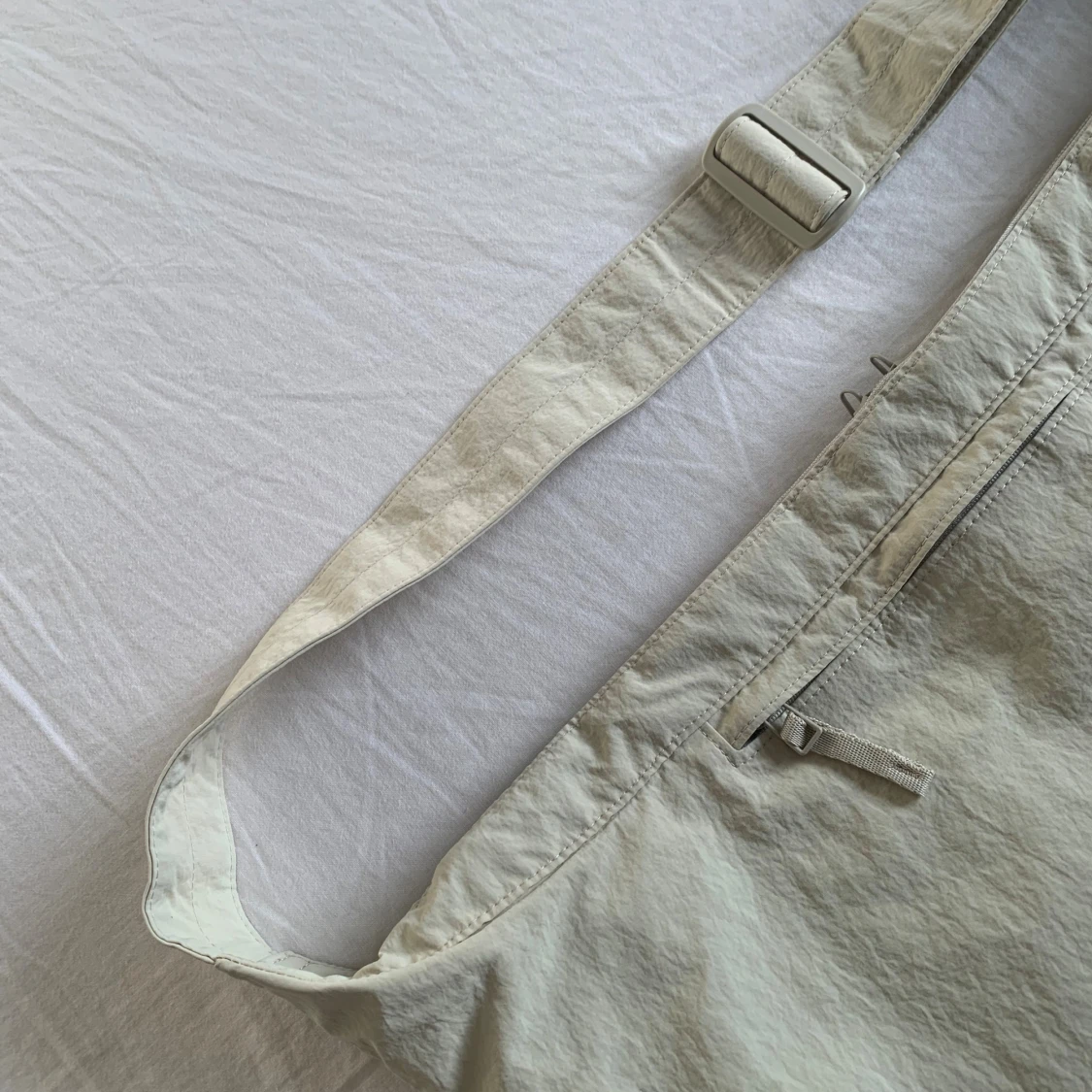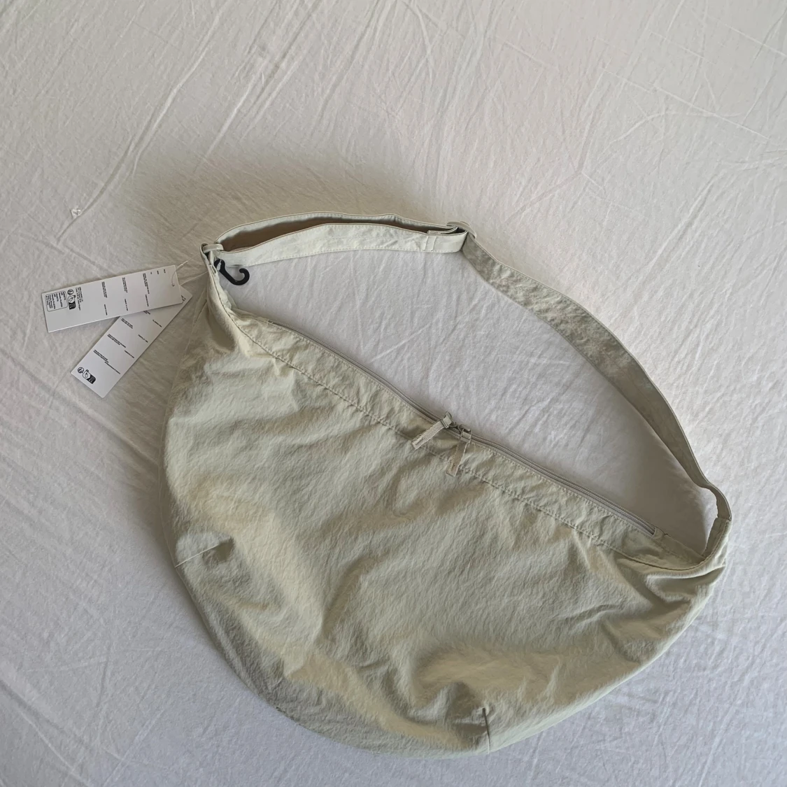 Uniqlo nylon axelväska i beige (mellanstorlek). Rymlig och lätt – rymmer A4-block, liten dator och vardagsprylar. Vattentåligt material och justerbar rem. I mycket fint skick, inget fel.