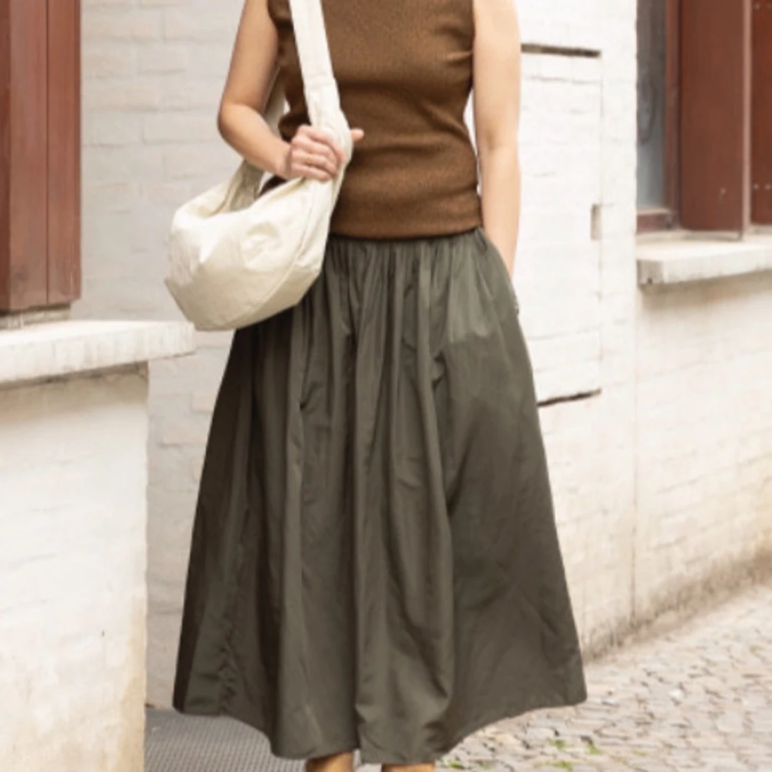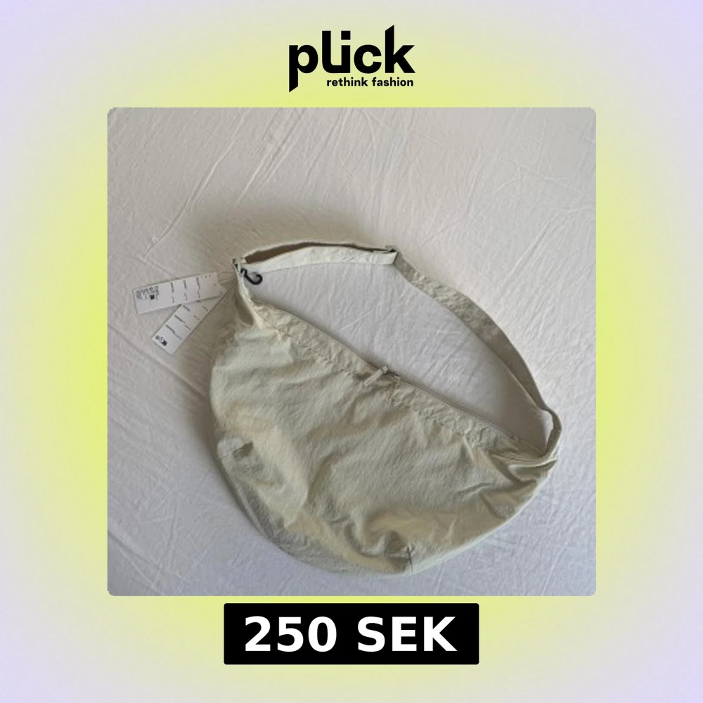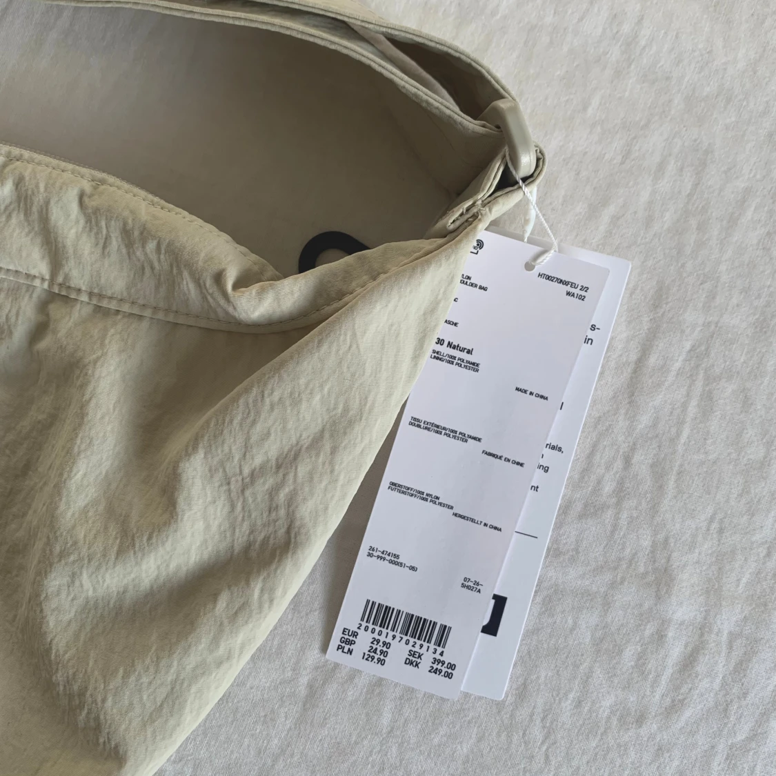 Uniqlo nylon axelväska i beige (mellanstorlek). Rymlig och lätt – rymmer A4-block, liten dator och vardagsprylar. Vattentåligt material och justerbar rem. I mycket fint skick, inget fel.