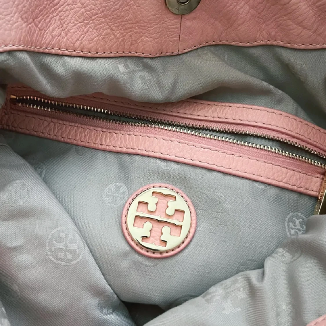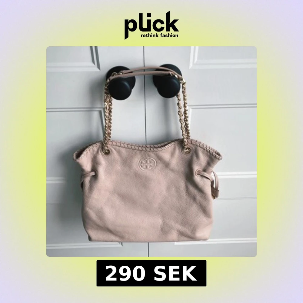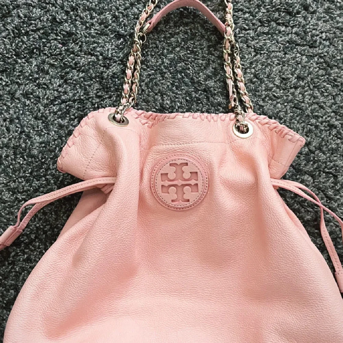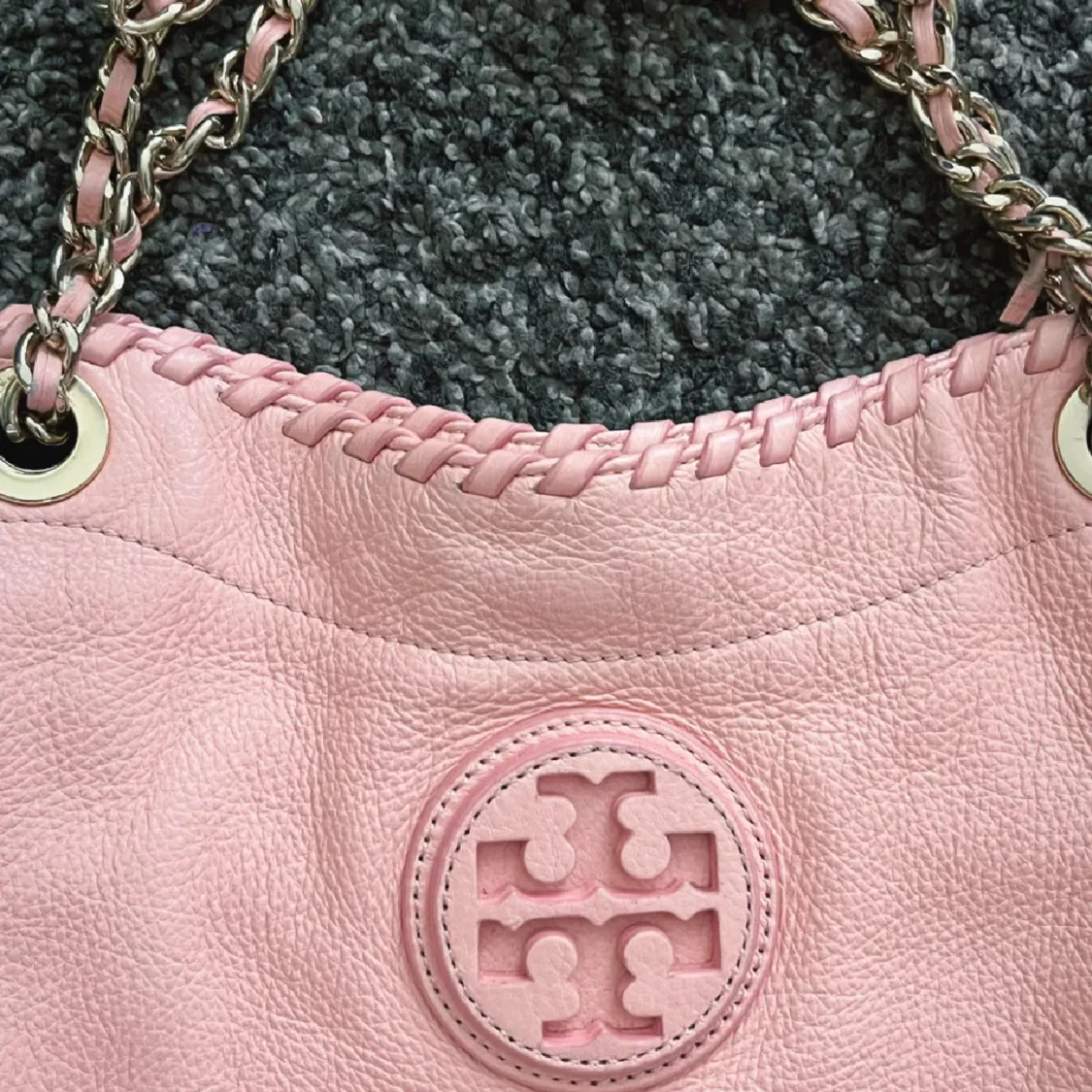 Säljer en snygg ljusrosa axelväska från Tory Burch i mjukt skinn. Väskan har kedjehandtag med läderdetaljer, dekorativt flätad kant och det klassiska logotyp-emblemet framtill.