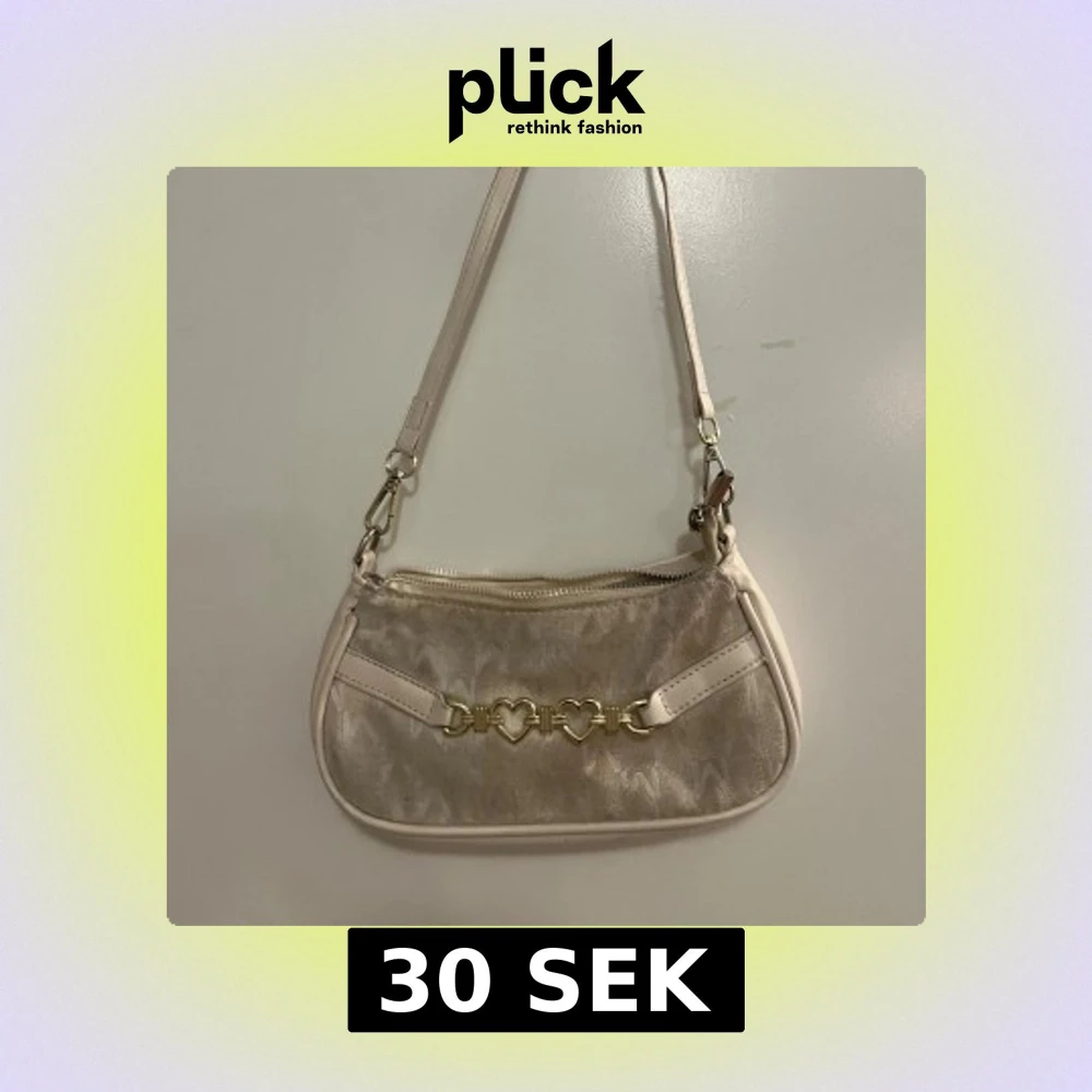 Säljer en söt beige axelväska med guldfärgade hjärtformade detaljer på framsidan. Väskan har en dragkedja upptill och en justerbar axelrem. Den är dock lite gammal och inte i perfekt skick men fungerar som nytt ändå