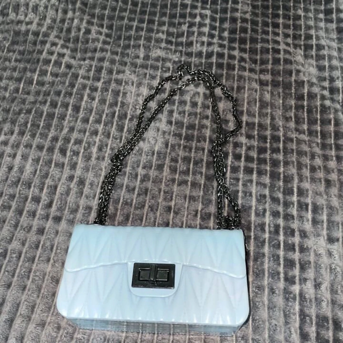Denna väskan är gjord av plast. Den är fin och bra att ha på fester. Det får plats mycket i väskan,den är använd en gång. Jag säljer denna väska för 100kr som är ett bra pris eftersom att jag köpte den för 300kr. Mer frågor ställs i dm. :)
