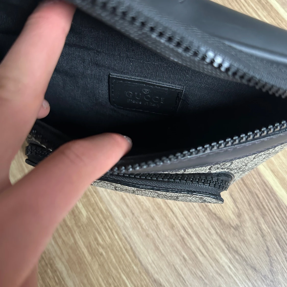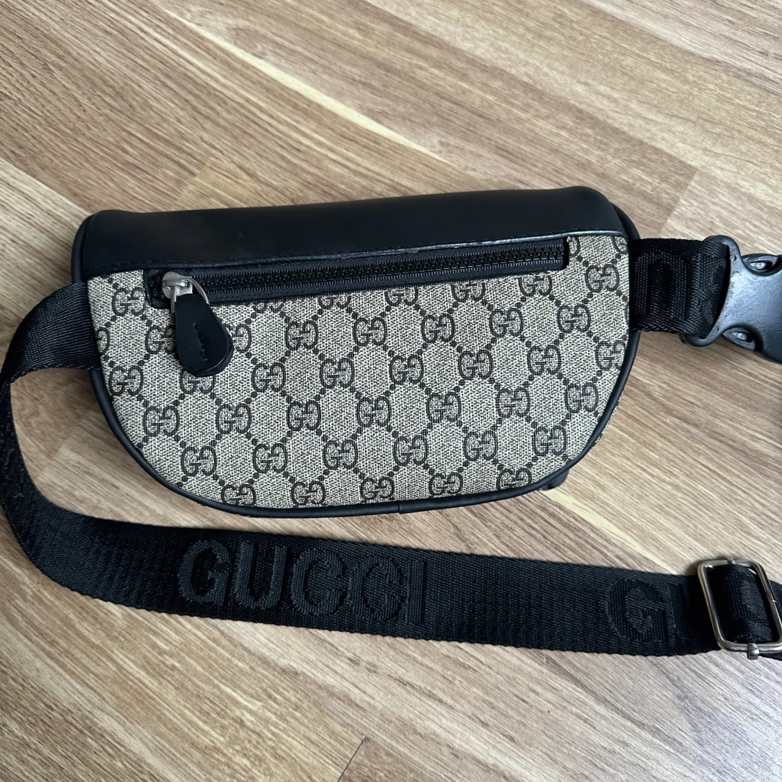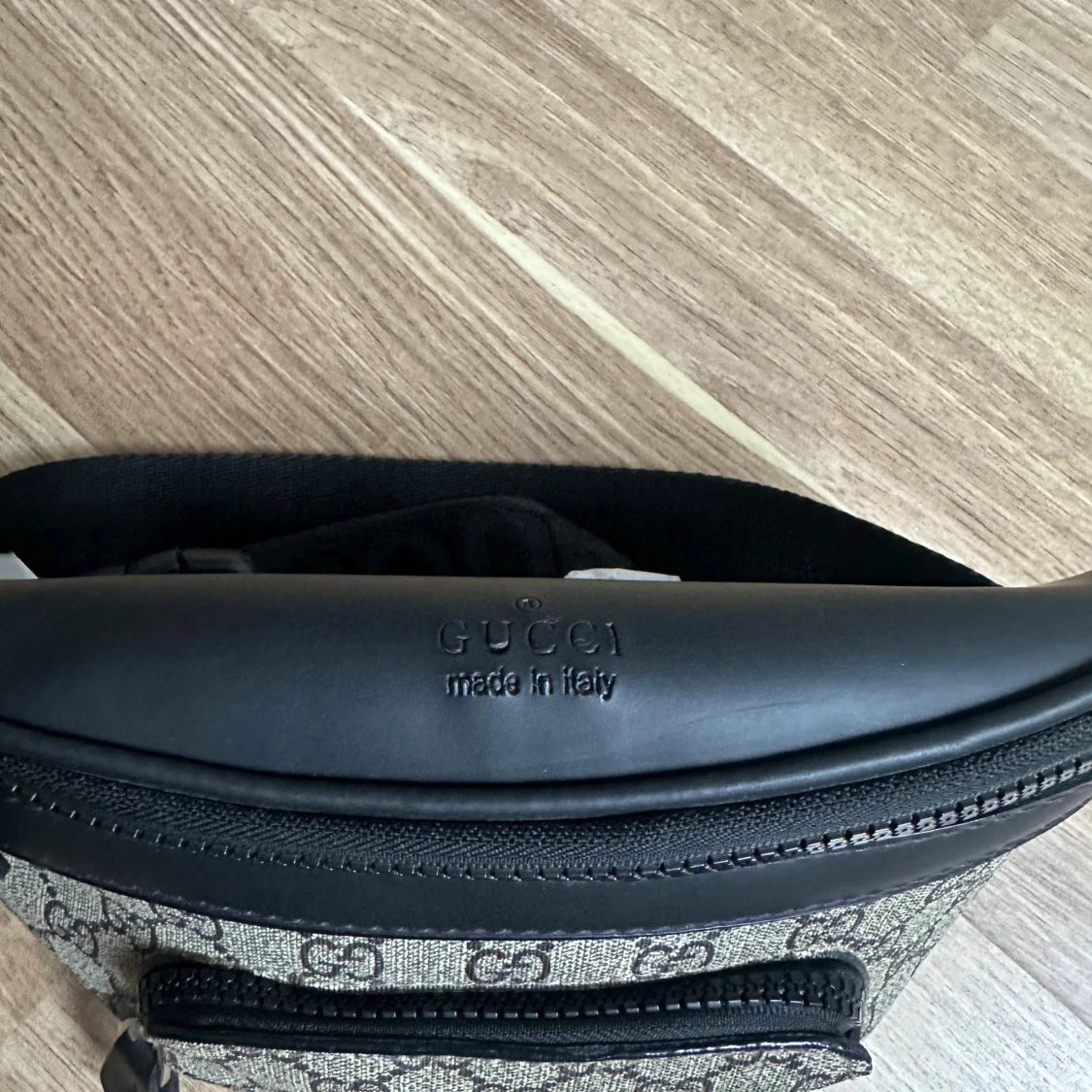 Snygg axelväska från H&M i beige och svart med klassiskt GG-mönster. Väskan har svarta detaljer i skinn, finns även flera fack med dragkedja. Perfekt för att bära det viktigaste och ge din outfit en lyxig touch.