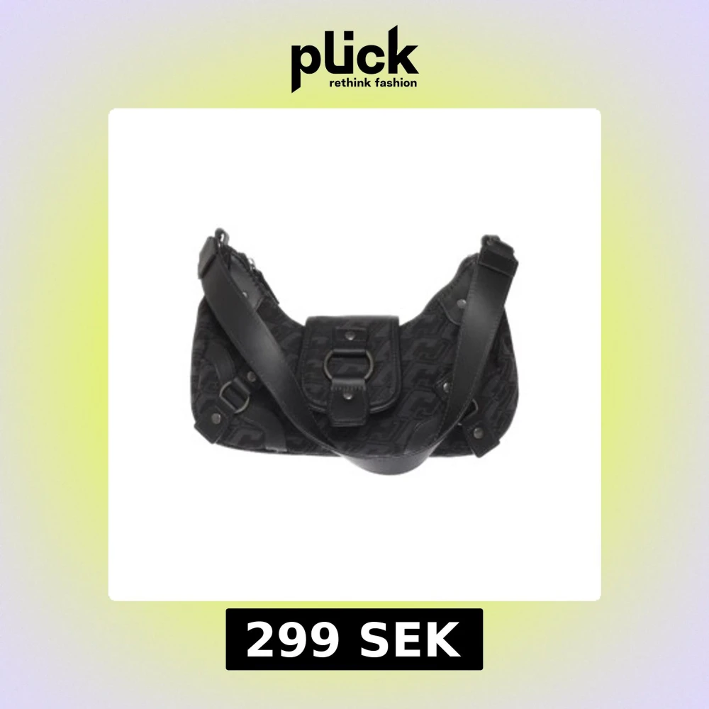 Säljer en svart axelväska med präglat mönster och bred axelrem i skinn. Väskan har ett lock med spänne och detaljer i metall. Perfekt storlek för det viktigaste och snygg att bära till många olika outfits.