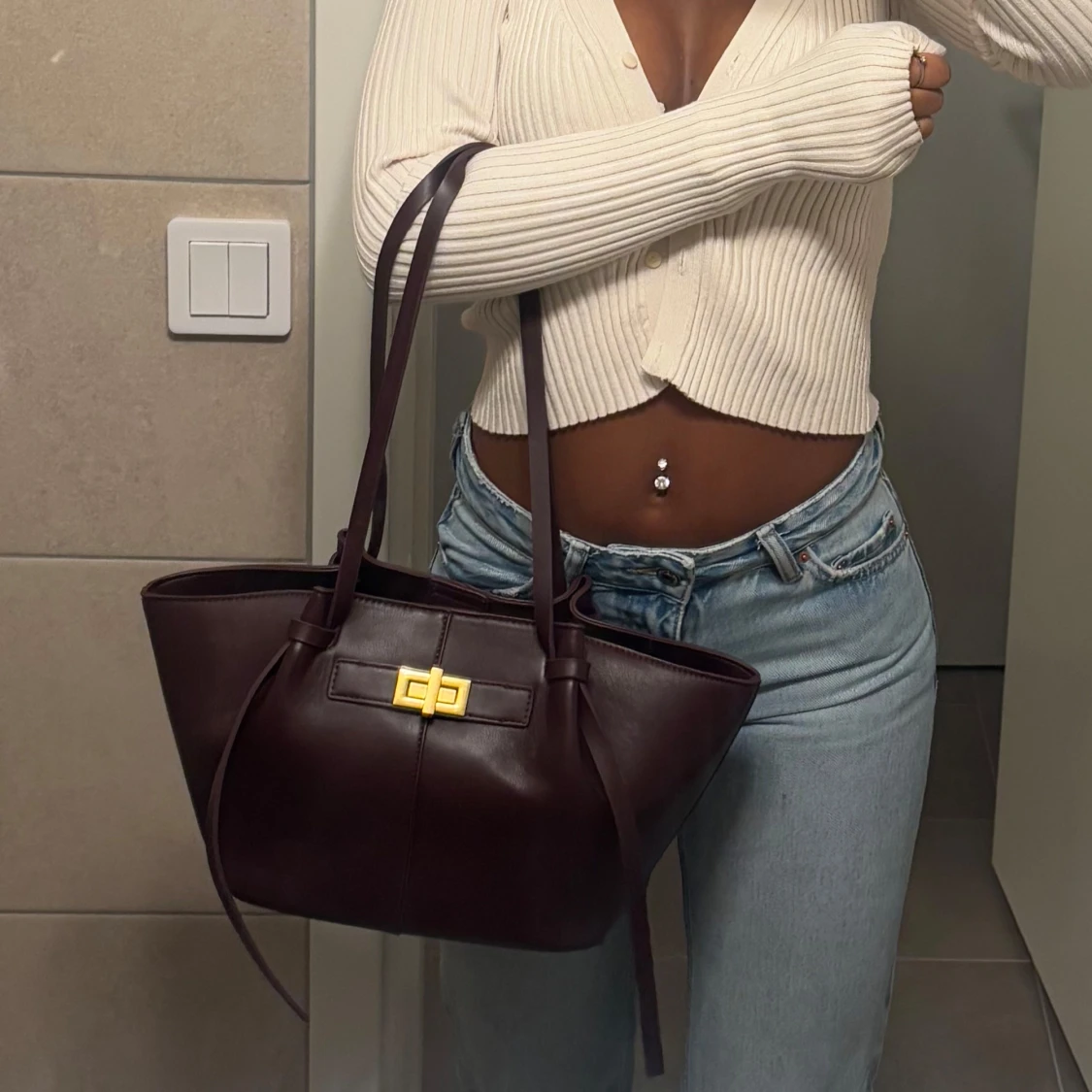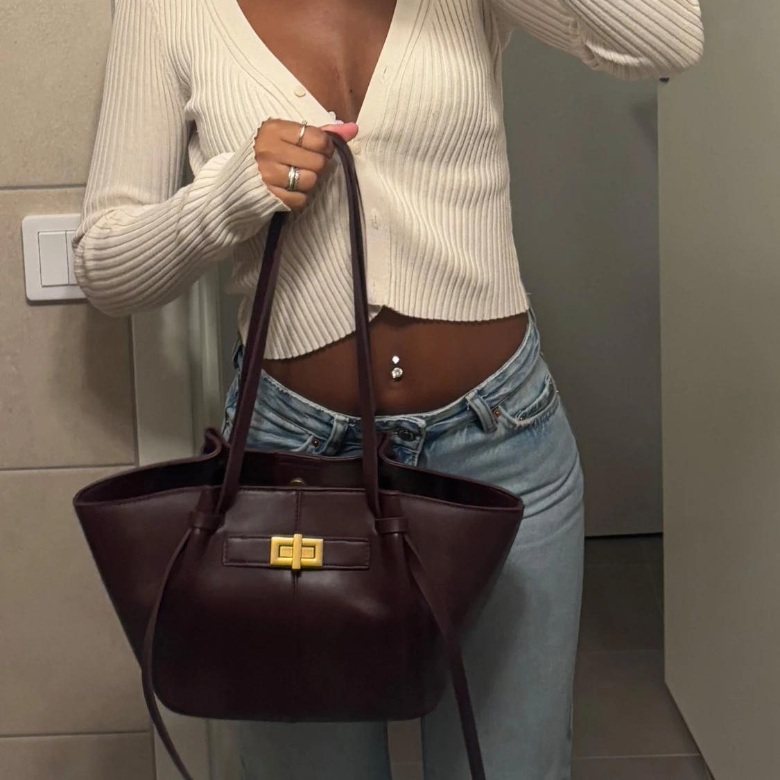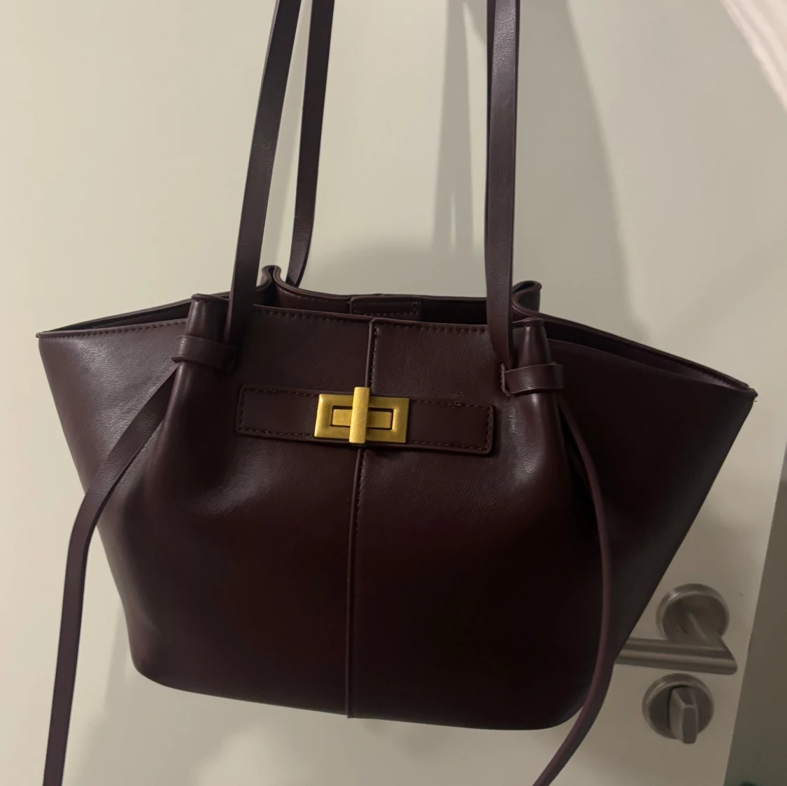 Säljer en stilren mörkbrun handväska i skinn med snyggt guldigt spänne framtill. Väskan har långa handtag och en rymlig form, perfekt för att bära med sig allt man behöver. Enkel och klassisk design som passar till många outfits.