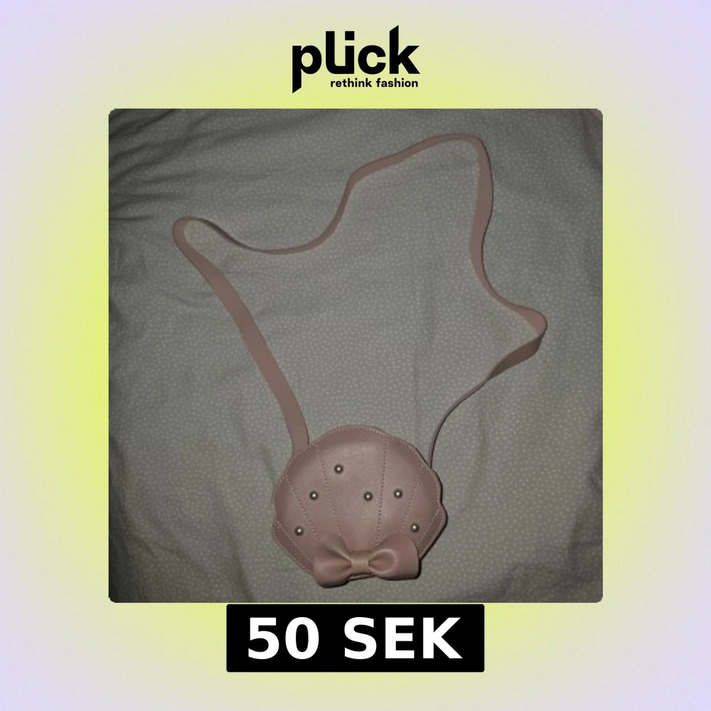 Supergullig ljusrosa axelväska i form av en snäcka, dekorerad med små pärlor och en söt rosett framtill. Väskan har ett långt axelband och är perfekt för att bära småsaker. Baksidan är slät och enkel.
