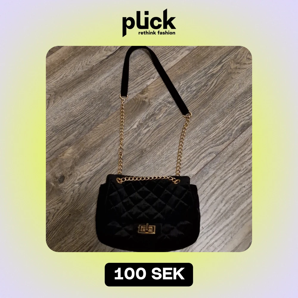 Snygg svart axelväska i quiltad design med guldkedja och vridlås. En mobil får lätt plats tillsammans med flera saker. På sista bilden kan ni jämföra storleken med en hand