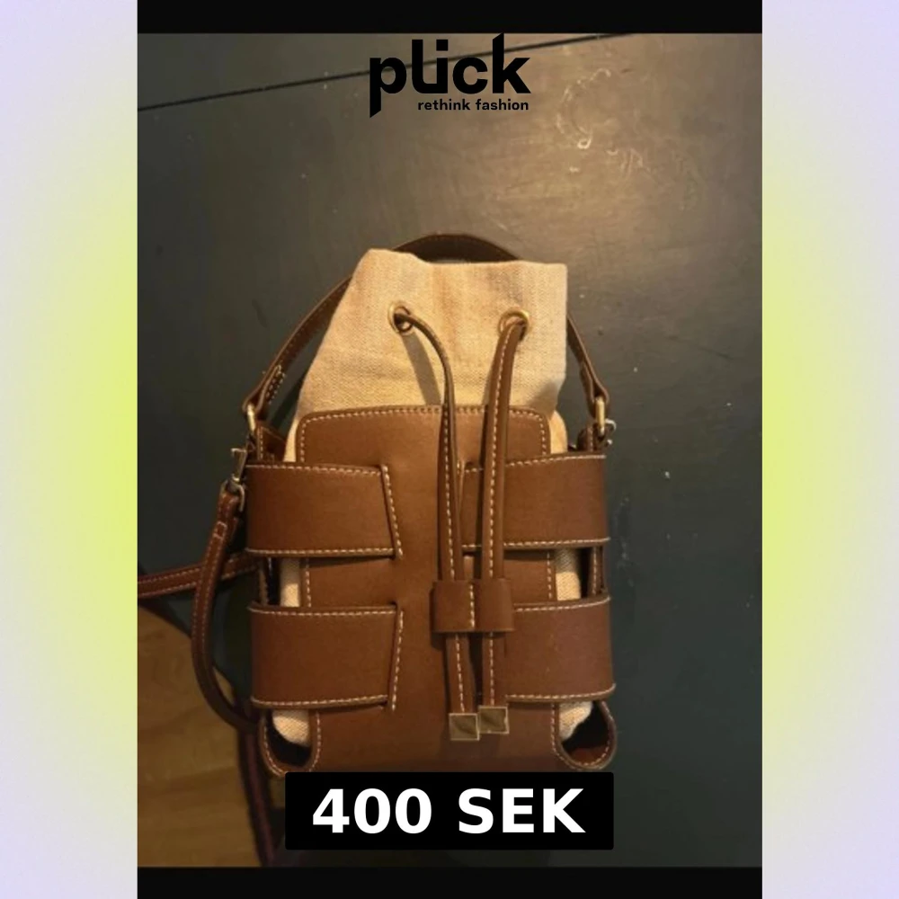 Snygg handväska i brun skinnimitation med beige tyginsats. Väskan har coola detaljer med synliga sömmar och snörning upptill. Axelremmen är justerbar och väskan har en unik form som sticker ut. Perfekt för dig som gillar stilrena accessoarer med twist.